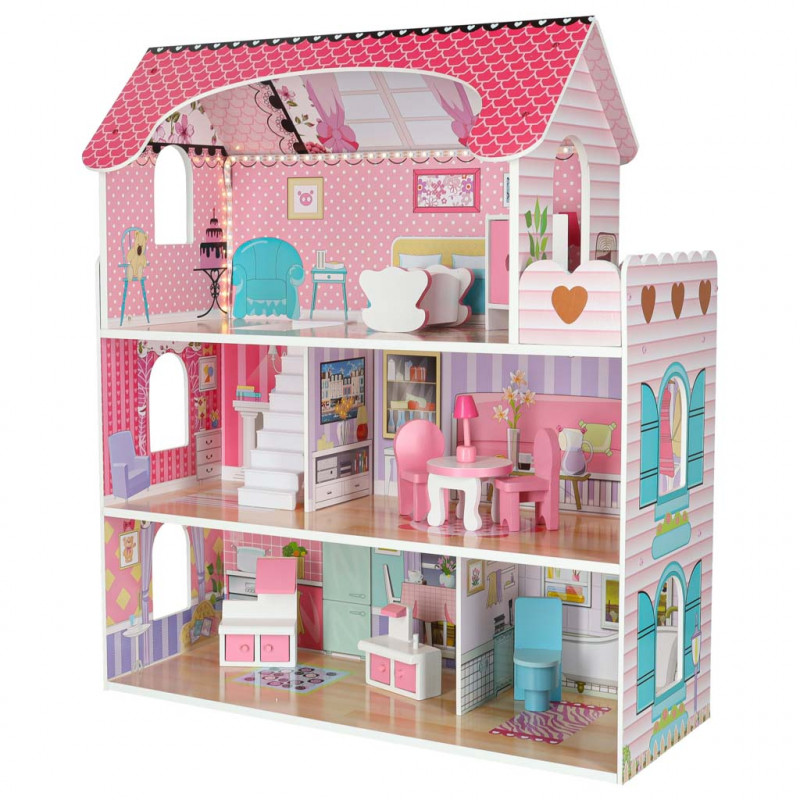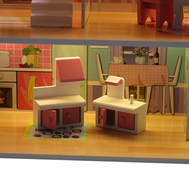 Scurta descriere Casuta din lemn pentru papusi are trei etaje si cinci camere decorate cu grafica colorata. Include mobilier si banda LED, oferind o experienta de joaca realista si captivanta pentru copii.