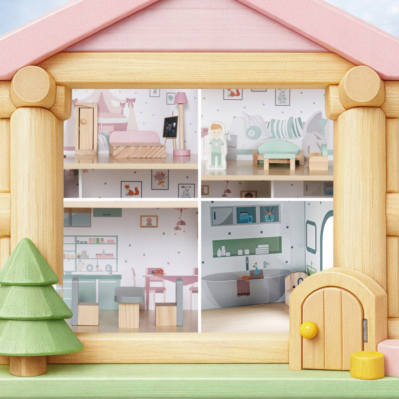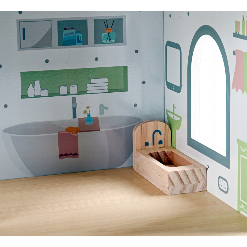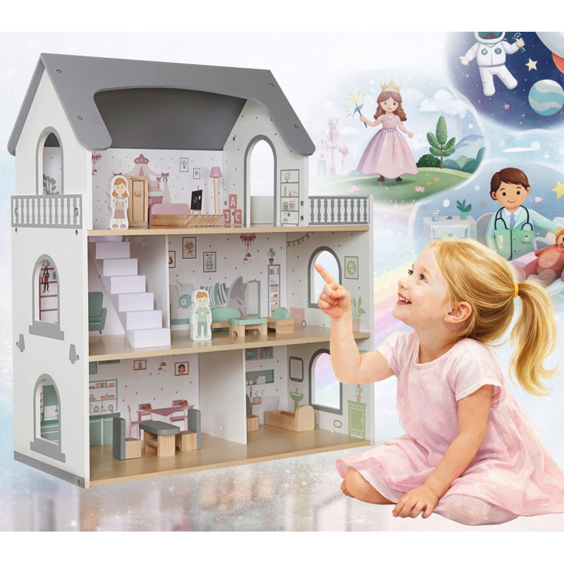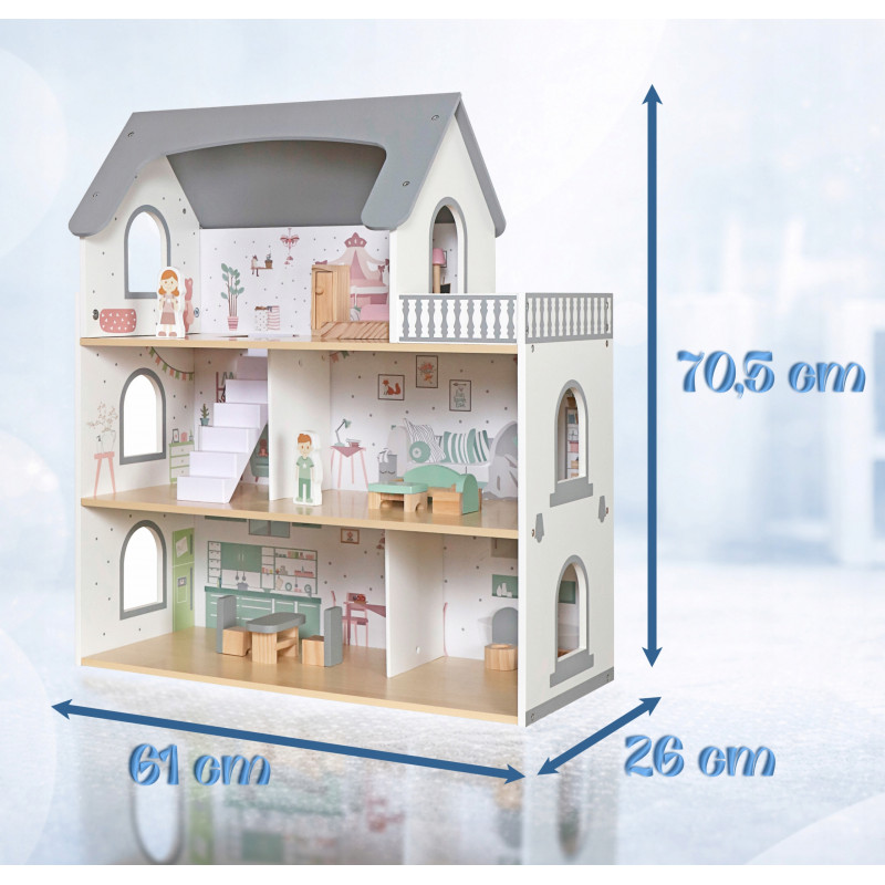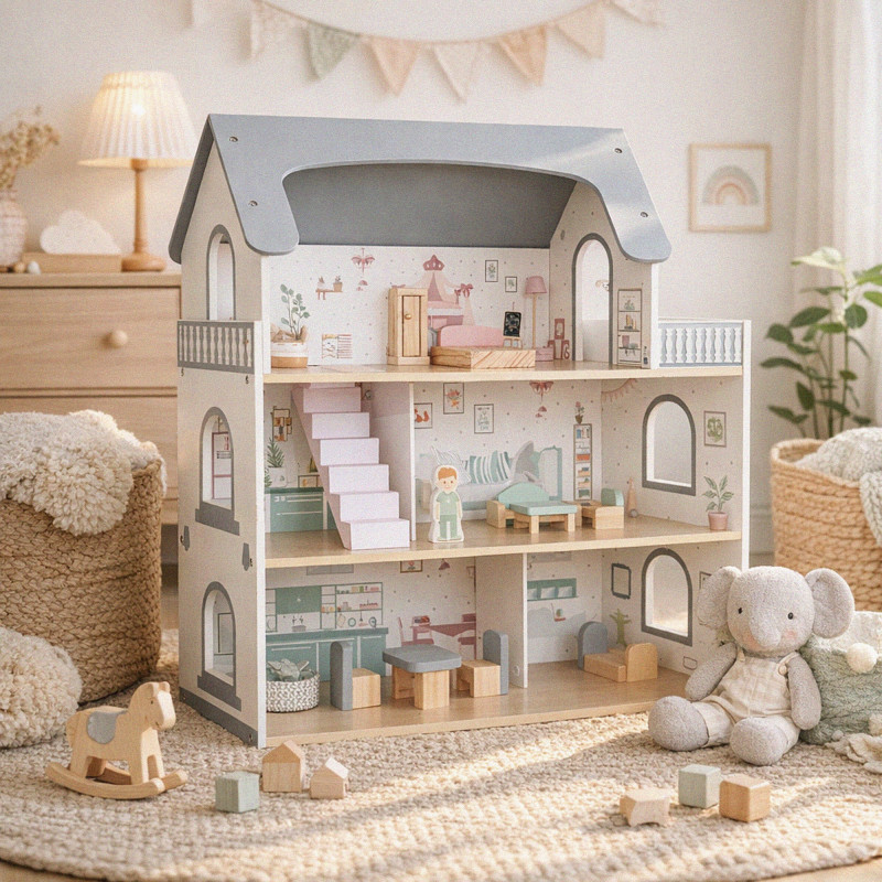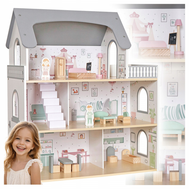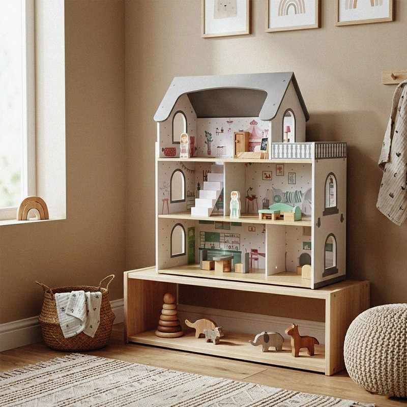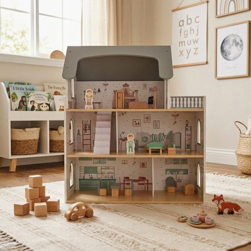 Scurta descriere Casuta pentru papusi din lemn este o jucarie complexa si atractiva, ideala pentru jocuri de rol. Prevazuta cu 3 niveluri, terasa, scari si accesorii, permite copiilor sa creeze si sa organizeze propriile scenarii de viata. Setul include mobilier si figurine, oferind multiple posibilitati de amenajare. Constructia solida si finisajele atent realizate asigura siguranta si durabilitate in utilizare, fiind potrivita pentru acasa sau gradinita.