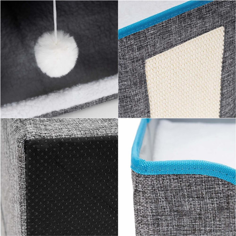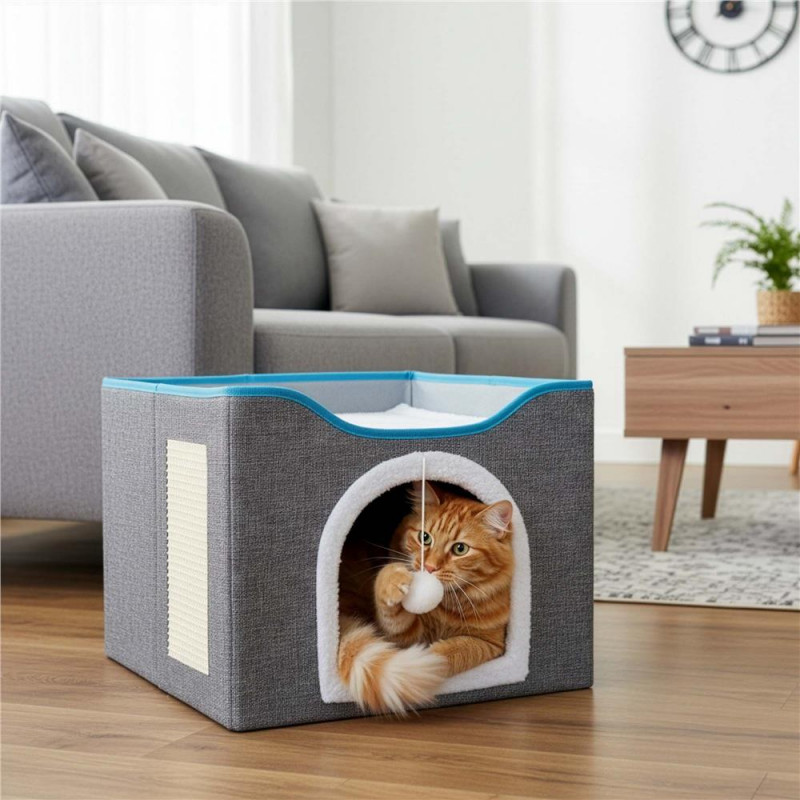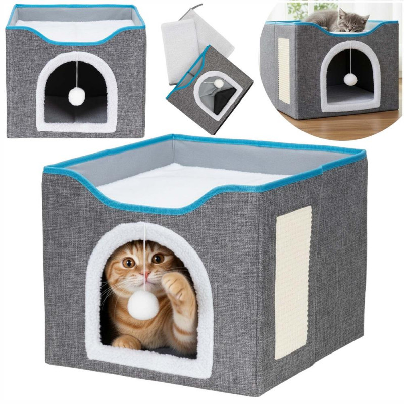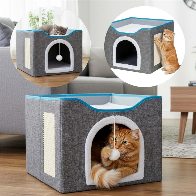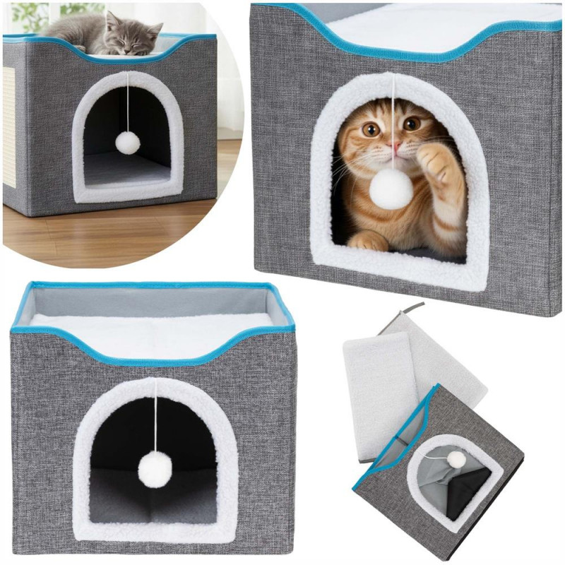 Scurta descriere: Casuta multifunctionala pentru pisici, conceputa pentru odihna, joaca si zgariat intr-un singur spatiu compact. Structura din lemn asigura stabilitate, iar elementele textile ofera confort zilnic. Platforma superioara si jucaria suspendata stimuleaza activitatea si relaxarea animalului.