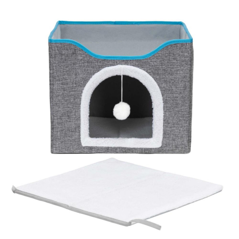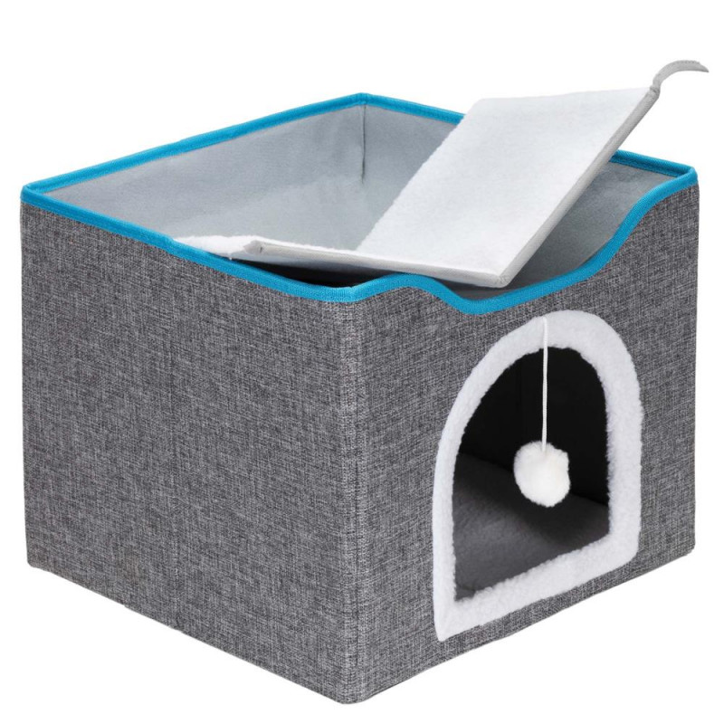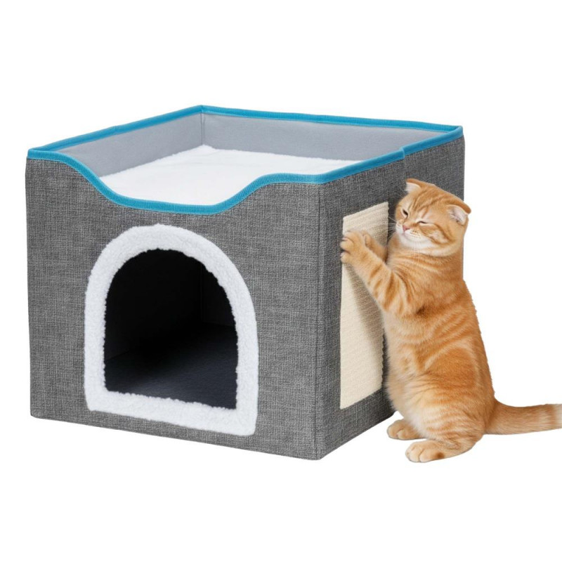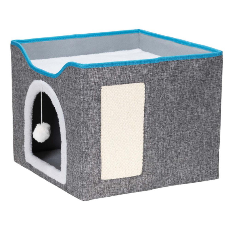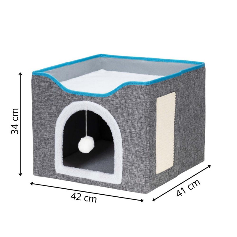 Scurta descriere: Casuta multifunctionala pentru pisici, conceputa pentru odihna, joaca si zgariat intr-un singur spatiu compact. Structura din lemn asigura stabilitate, iar elementele textile ofera confort zilnic. Platforma superioara si jucaria suspendata stimuleaza activitatea si relaxarea animalului.