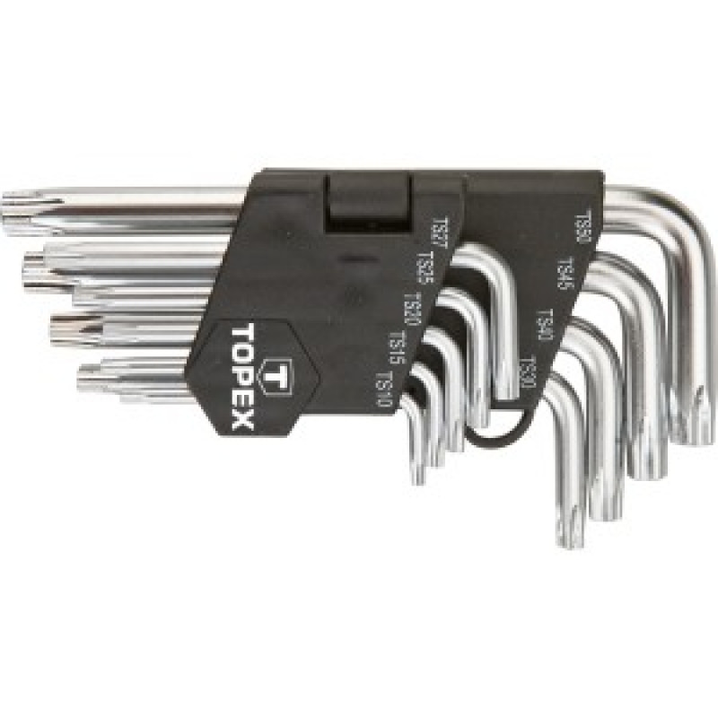 Set chei cinci unghiulare scurte TOPEX, cu dimensiuni intre TS 10 -50. Fabricat din otel-crom vanadiu durabil, asigurand o viata lunga instrumentului. Ambalaj din plastic practic, cu un compartiment pentru fiecare element, usurand depozitare acestora. Marca TOPEX se adreseaza mesterilor.