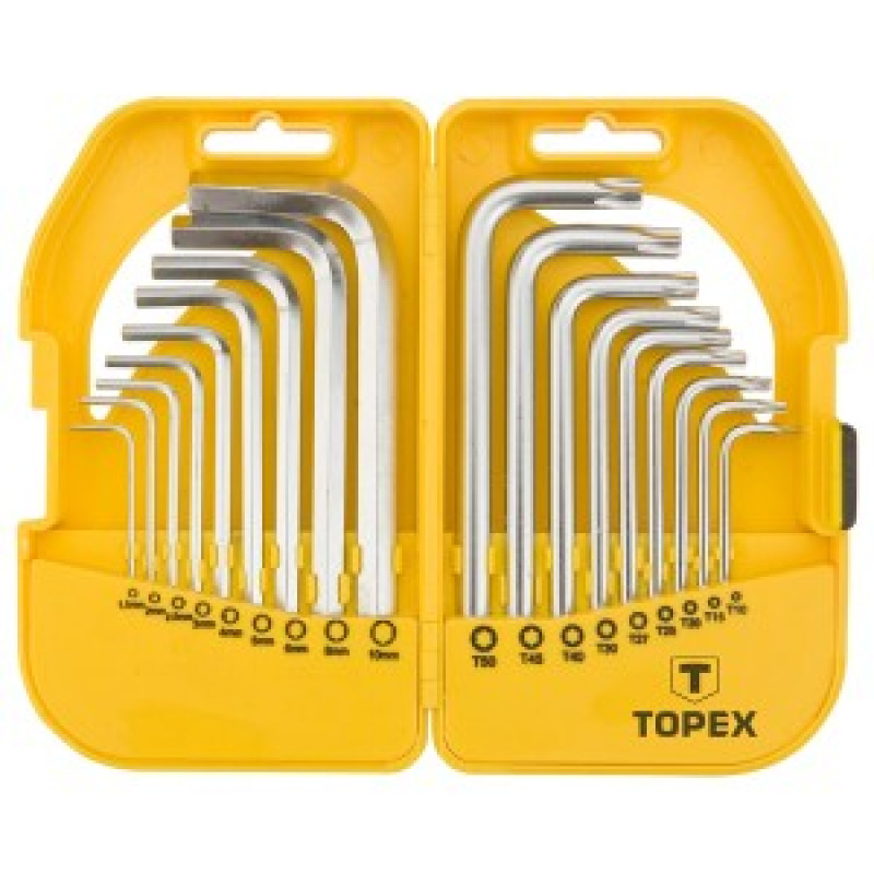 Set chei scurte hexagonale si Torx TOPEX foarte util pentru lucrul mecanic si de atelier. Fabricat din otel-crom vanadiu durabil, asigurand o viata lunga instrumentului. Ambalaj din plastic practic, cu un compartiment pentru fiecare element, usurand depozitare acestora. Marca TOPEX se adreseaza mesterilor.