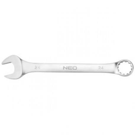 Cheie combinata NEO (ref. 09-668) 24 x 280 mm, fabricata in conformitate cu DIN 3113. Otelul crom-vanadiu de inalta calitate asigura durabilitatea cheilor pe termen lung. Calitatea uneltei este confirmata de certificatul TÜV si de garantia de 25 de ani a producatorului. Marca NEO raspunde asteptarilor profesionistilor.
