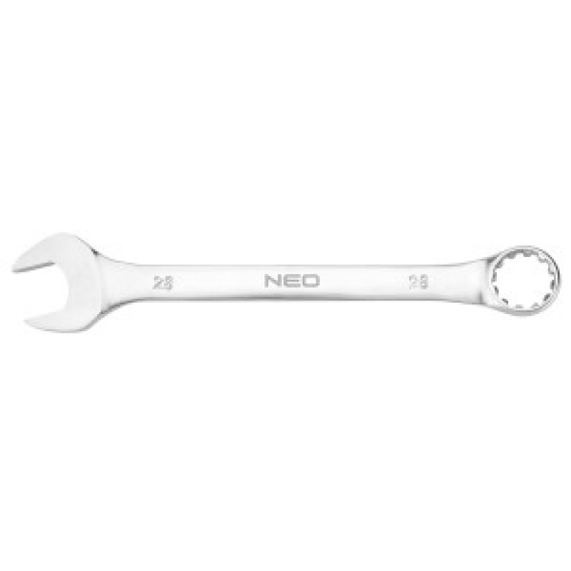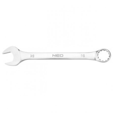 Cheie combinata NEO (ref. 09-672) 28 x 310 mm, fabricata in conformitate cu DIN 3113. Otelul crom-vanadiu de inalta calitate asigura durabilitatea cheilor pe termen lung. Calitatea uneltei este confirmata de certificatul TÜV si de garantia de 25 de ani a producatorului. Marca NEO raspunde asteptarilor profesionistilor.