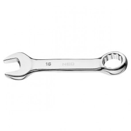Cheie combinata NEO (ref. 09-768) dimensiune 16 x 123 mm, realizata in conformitate cu DIN 3113. Otelul crom vanadiu de inalta calitate asigura durabilitatea pe termen lung a cheii. Bratul scurt faciliteaza lucrul in locuri greu accesibile. Calitatea uneltei este confirmata de certificatul TÜV si de garantia de 25 de ani a producatorului. Marca NEO raspunde asteptarilor profesionistilor.