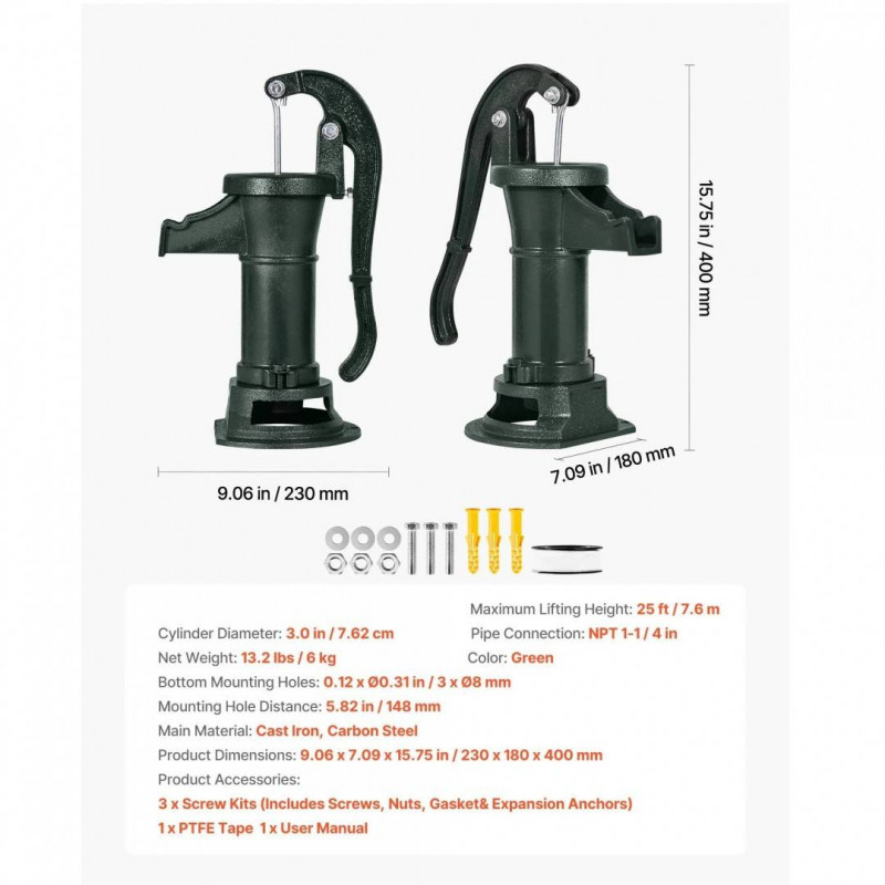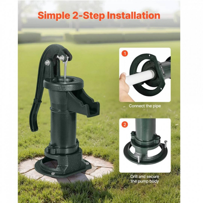 Stil vintage atemporal: Aceasta pompa manuala pentru put are un design retro clasic, ideala pentru pomparea in iazuri, fantani, gradini, locuri de campare, curti, ferme si parcuri. Atat decorativa, cat si practica, serveste ca o frumoasa decoratiune pentru gradina atunci cand nu este utilizata.
