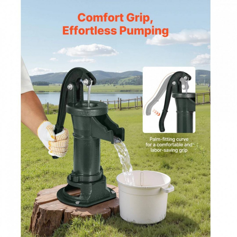 Pompare eficienta a apei: Conceputa pentru puturi putin adanci sau puncte de put, aceasta pompa manuala de apa din fonta ridica apa de la adancimi de pana la 7,6 m. Potrivita pentru majoritatea nivelurilor de apa subterana. Nu necesita electricitate, trebuie doar sa o instalati si sa incepeti pomparea.