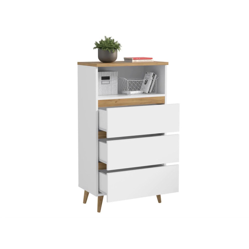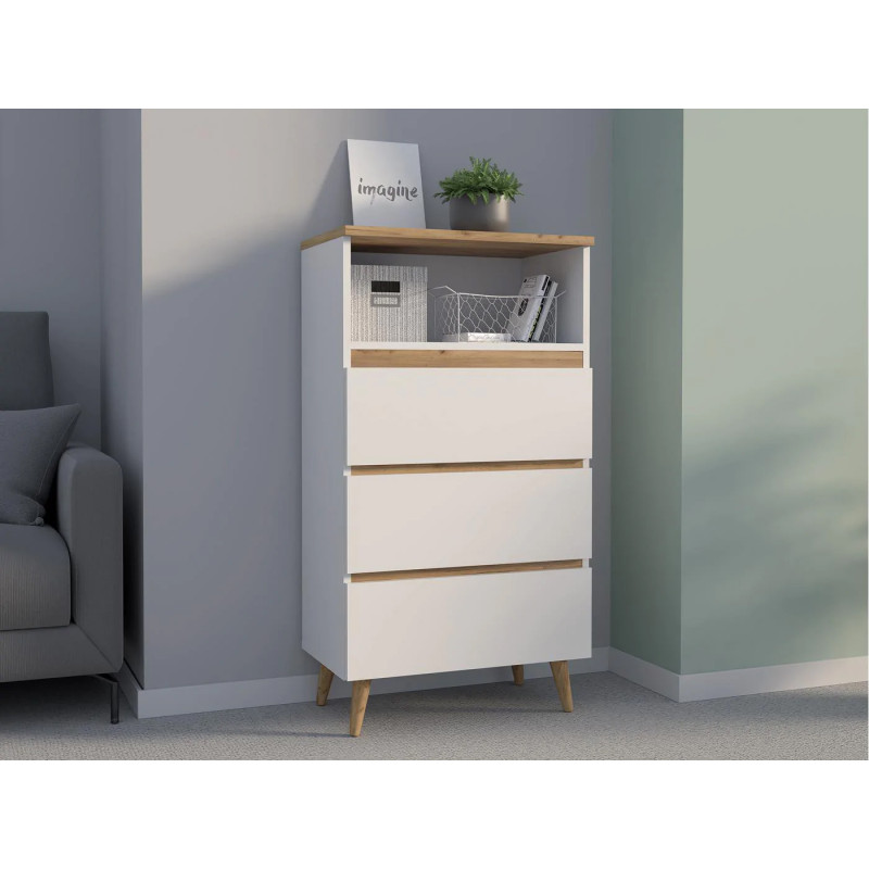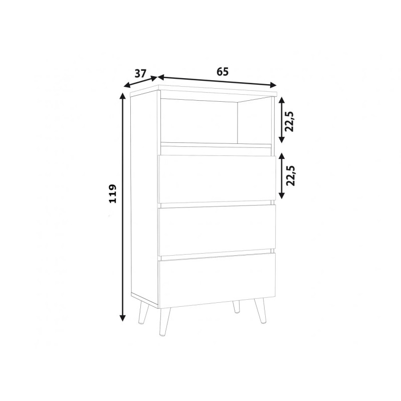 Scurta descriere Comoda tip biblioteca Norge 03 este ideala pentru camere de adolescenti sau spatii moderne. Designul sau simplu si elegant include 3 sertare adanci fara manere si un raft deschis, perfect pentru carti sau decoratiuni. Construita din materiale durabile si sustinuta de picioare din lemn natural, aceasta piesa se integreaza perfect in colectia modulara Norge.