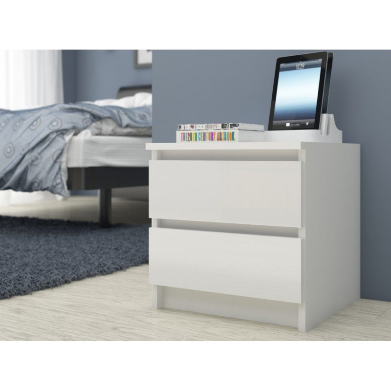 Scurta descriere Comoda moderna cu 2 sertare complet alba, realizata din PAL laminat de 16 mm, rezistent la uzura. Designul minimalist si finisajul mat se integreaza perfect atat in interioare moderne, cat si clasice, oferind spatiu suplimentar pentru depozitare.