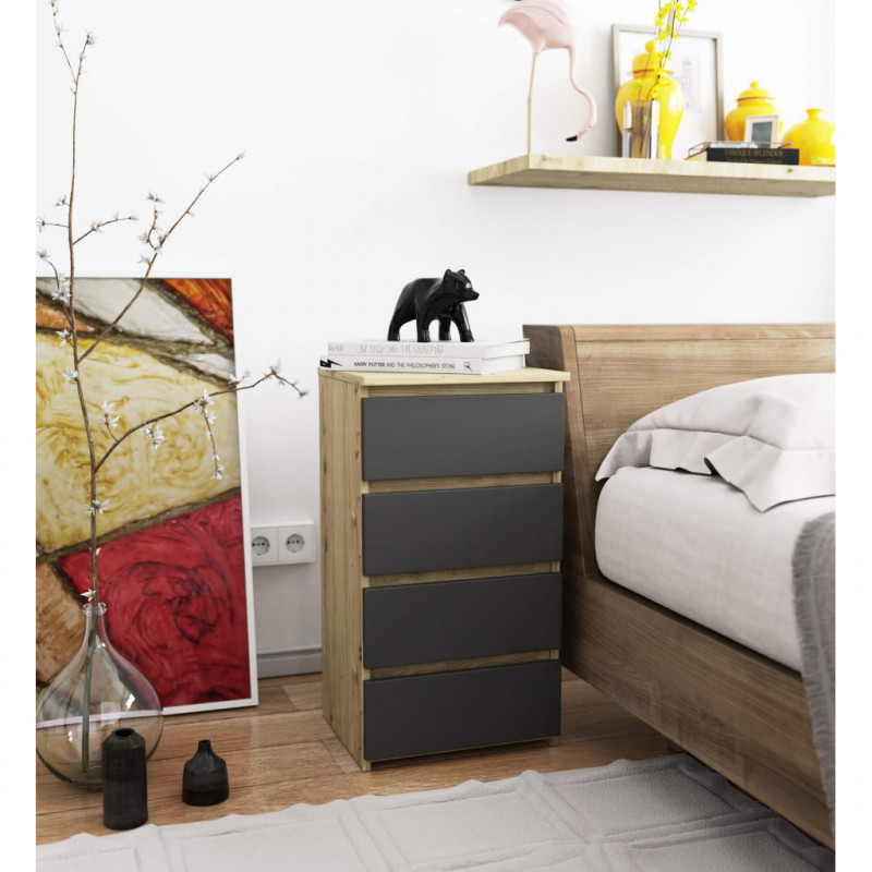 Scurta descriere Comoda CL4 cu 4 sertare in combinatia stejar artisan cu fronturi gri este o piesa eleganta si practica pentru dormitor, camera copilului sau birou. Realizata din PAL laminat rezistent si protejata cu margini ABS, ofera spatiu de depozitare bine organizat, iar sertarele gliseaza lin datorita sistemului metalic.