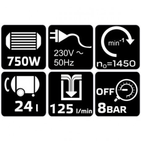 Compresorul fara ulei de 24 litri, 12K021-1 de la NEO TOOLS este un compresor fara ulei cu o capacitate de 24 litri, o presiune maxima de 8 bar si o putere de 750 wati. Necesita o sursa de alimentare de 230 V/ 50 Hz. Are un debit de aer de 125 l/min, un timp de umplere de 135 de secunde si un nivel de zgomot de 80 dB. Compresorul fara ulei NEO TOOLS are un motor cu inductie puternic si o supapa de scurgere cu bila. Este recomandat pentru atelierele profesionale, unde accesul usor la conectori, reglarea presiunii si manometre, precum si posibilitatea de a lucra cu o gama larga de unelte pneumatice - este foarte important. Manerul convenabil il face usor de transportat.