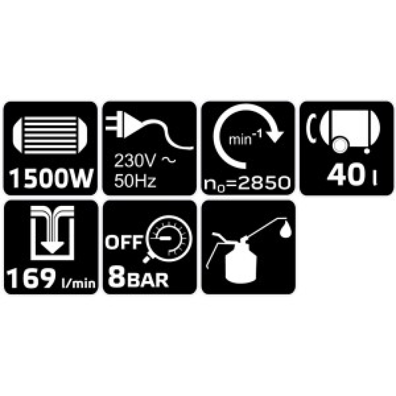 Compresorul vertical cu ulei 12K010-1 de la NEO TOOLS, de 40 litri, 230 volti, este un compresor cu ulei de 1.500 wati, de 40 litri. Acesta necesita o sursa de alimentare de 230 V/ 50 Hz. Are un aport de aer de 169 l/min, o turatie maxima de 2.850 rpm, un timp de umplere de 152 de secunde si un nivel de zgomot de 97 dB. Datorita designului sau vertical, compresorul vertical de ulei NEO TOOLS ocupa putin spatiu, pastrand capacitatea maxima pentru acest tip de echipament. Este recomandat pentru atelierele profesionale, unde accesul usor la conectori, reglarea presiunii si manometre, precum si posibilitatea de a lucra cu o gama larga de unelte pneumatice, este foarte important. Manerul convenabil il face usor de transportat.