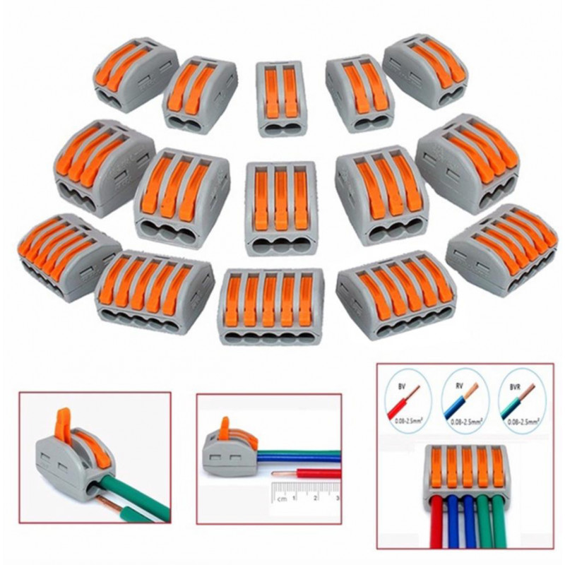 Adauga siguranta si eficienta instalatiilor tale cu acest conector rapid pentru cabluri electrice, disponibil in varianta cu 2 sau 3 poli. Ideal pentru montajul de lustre, oglinzi LED, aplice sau alte corpuri de iluminat. - Instalare fara surub - sistem cu parghie de blocare - Compatibil cu fire intre 0.08 si 2.5 mm2 - Functioneaza cu fire monofilare si multifilare - Usor de conectat si reconectat - solutie reutilizabila - Ideal pentru montaj DIY, fara scule speciale Alege varianta potrivita - 2 poli pentru 2 fire sau 3 poli pentru 3 fire - si simplifica instalarea in doar cateva secunde.