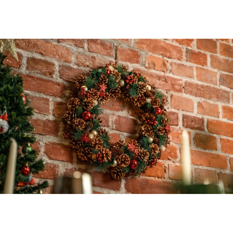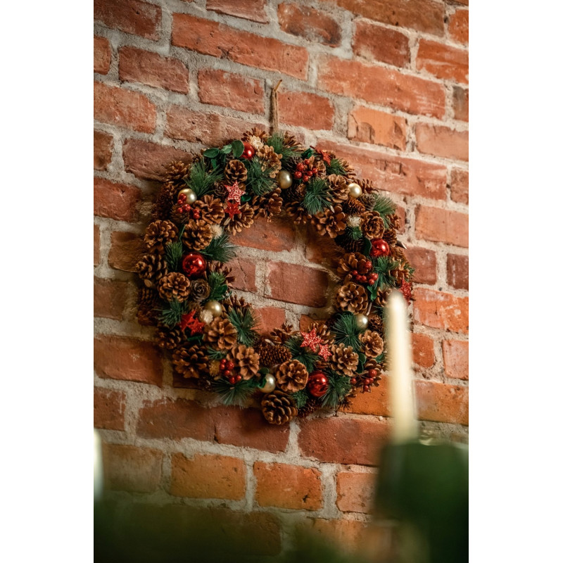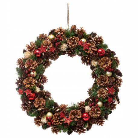 Scurta descriere Coronita decorativa aduce farmecul sarbatorilor de iarna in orice locuinta. Decorata cu frunze, conuri de pin si stelute, este perfecta pentru a fi asezata pe masa, agatata pe usa sau folosita ca decor central in aranjamente festive.