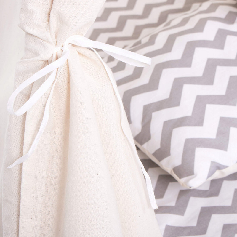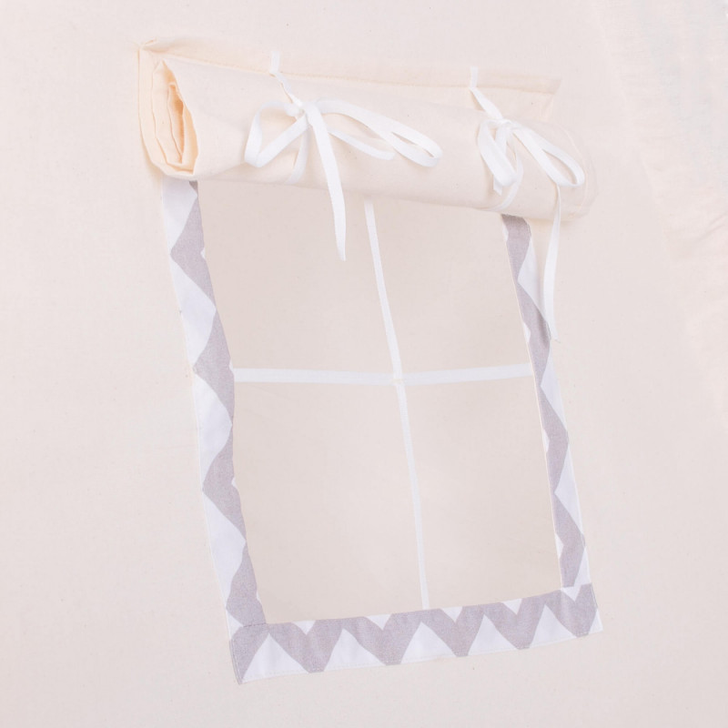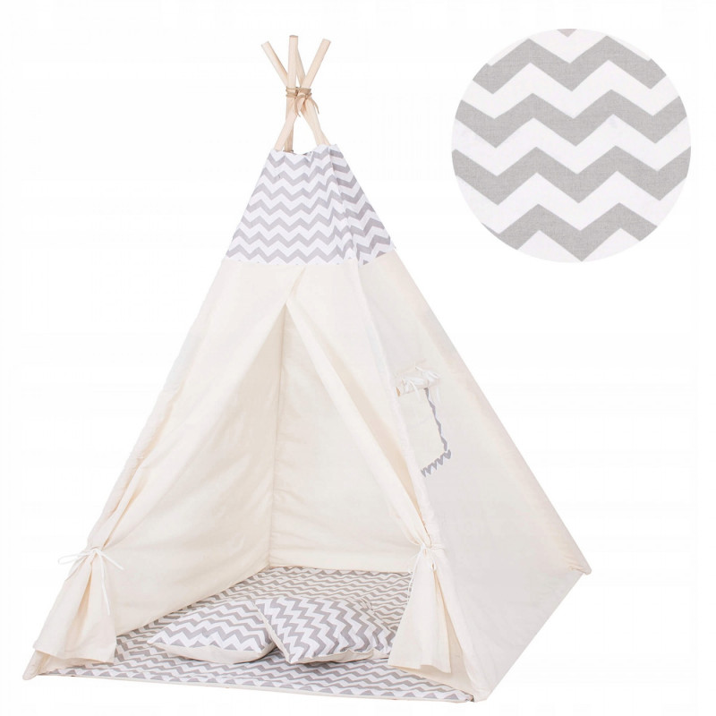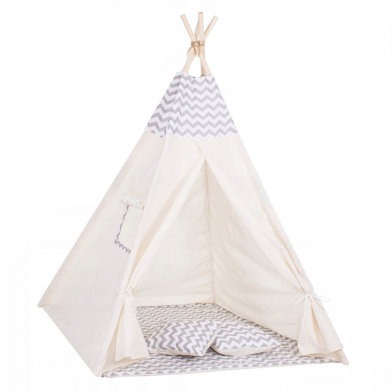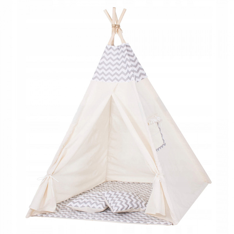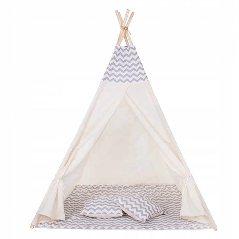 Corturile stil indian Teepee Tent sunt cele mai la moda locuri de joaca in camerele copiilor, iar in zilele insorite de vara vor fi perfecte si in gradina sau pe terasa. Acestea va vor permite sa dezvoltati imaginatia celor mai tineri membri ai familiei in timp ce se vor juca cu fratii sau prietenii. Serile petrecute impreuna cu parintii pot fi diversificate ramanand inauntru in timp ce citesti basmele tale preferate.Productia acestui produs se caracterizeaza in primul rand prin sarguinta si grija pentru selectarea celor mai bune materiale. Tesatura din bumbac garanteaza circulatia aerului, iar umplutura din puf asigura confort in timp ce va jucati si va odihniti in interiorul cortului. Fereastra laterala are o ruleta care poate fi utilizata pentru a acoperi interiorul cortului in timpul unui pui de somn in timpul zilei. Corturile sunt potrivite pentru copii de toate varstele.Pentru a oferi cel mai mare confort posibil, salteaua este echipata cu garnituri antiaderente care, atunci cand sunt atasate de cadru, asigura ca materialul nu se misca. Pernele incluse in set sunt un accesoriu obligatoriu atunci cand petreceti timpul in cort. Copiii se pot odihni pe ele in timp ce asculta povesti sau cand se joaca.Cadrul este realizat din lemn de pin puternic. Lustruirea temeinica a betelor va asigura siguranta in timpul asamblarii si a jocului ulterior. Plierea si desfacerea cortului este extrem de simpla: conectati doi poli intre ei utilizand conectori puternici, apoi introduceti-i in tunelurile din material. Mai tarziu, este suficient sa legati betele impreuna si sa asezati in interior salteaua si pernele. In acest mod rapid si usor, puteti echipa camera unui copil cu un accesoriu nou.