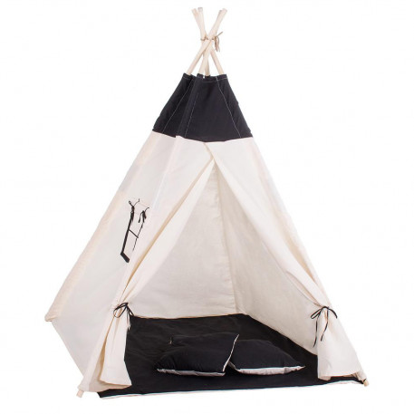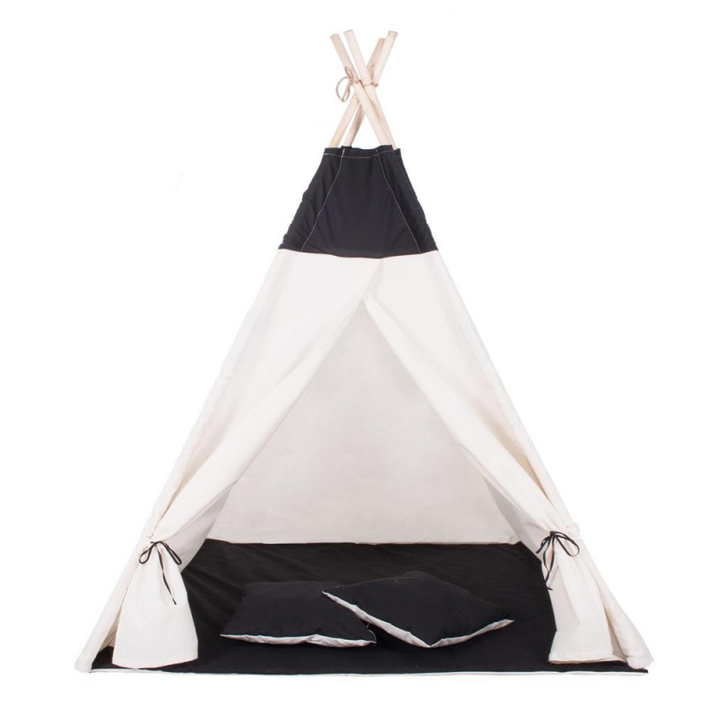 Corturile stil indian Teepee Tent sunt cele mai la moda locuri de joaca in camerele copiilor, iar in zilele insorite de vara vor fi perfecte si in gradina sau pe terasa. Acestea va vor permite sa dezvoltati imaginatia celor mai tineri membri ai familiei in timp ce se vor juca cu fratii sau prietenii. Serile petrecute impreuna cu parintii pot fi diversificate ramanand inauntru in timp ce citesti basmele tale preferate.Productia acestui produs se caracterizeaza in primul rand prin sarguinta si grija pentru selectarea celor mai bune materiale. Tesatura din bumbac garanteaza circulatia aerului, iar umplutura din puf asigura confort in timp ce va jucati si va odihniti in interiorul cortului. Fereastra laterala are o ruleta care poate fi utilizata pentru a acoperi interiorul cortului in timpul unui pui de somn in timpul zilei. Corturile sunt potrivite pentru copii de toate varstele.Pentru a oferi cel mai mare confort posibil, salteaua este echipata cu garnituri antiaderente care, atunci cand sunt atasate de cadru, asigura ca materialul nu se misca. Pernele incluse in set sunt un accesoriu obligatoriu atunci cand petreceti timpul in cort. Copiii se pot odihni pe ele in timp ce asculta povesti sau cand se joaca.Cadrul este realizat din lemn de pin puternic. Lustruirea temeinica a betelor va asigura siguranta in timpul asamblarii si a jocului ulterior. Plierea si desfacerea cortului este extrem de simpla: conectati doi poli intre ei utilizand conectori puternici, apoi introduceti-i in tunelurile din material. Mai tarziu, este suficient sa legati betele impreuna si sa asezati in interior salteaua si pernele. In acest mod rapid si usor, puteti echipa camera unui copil cu un accesoriu nou.