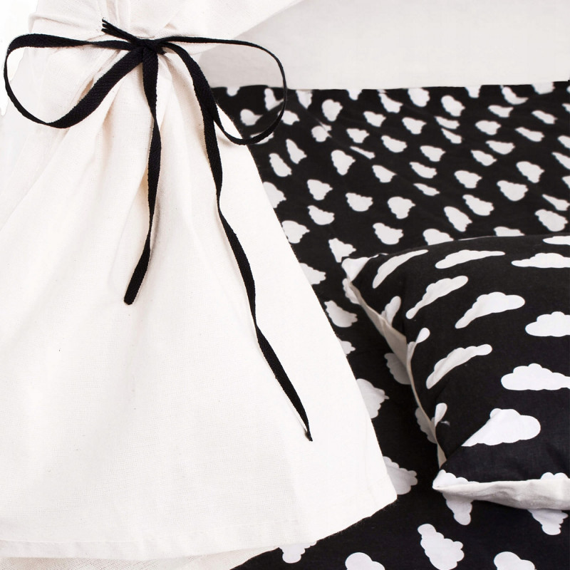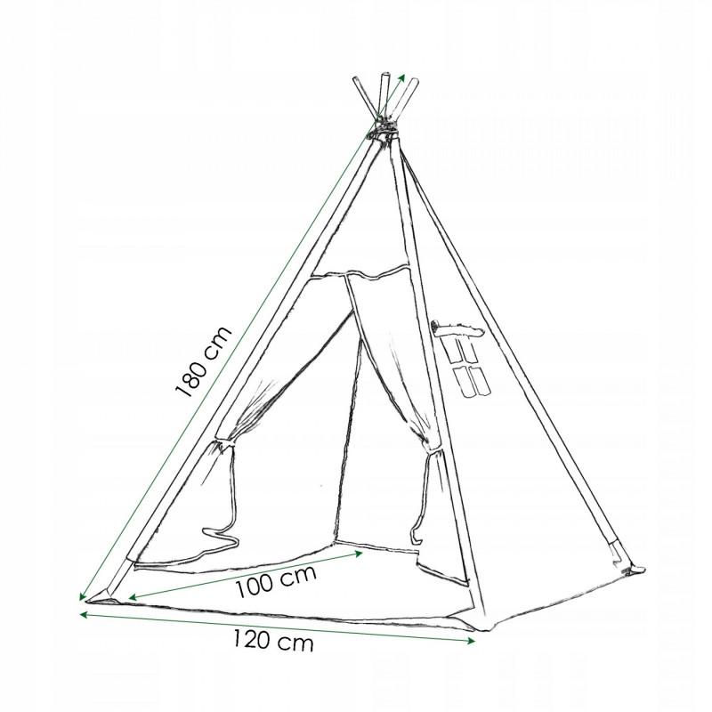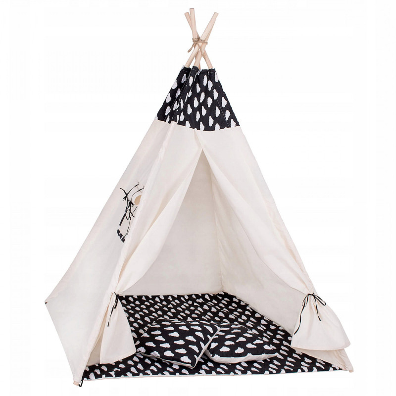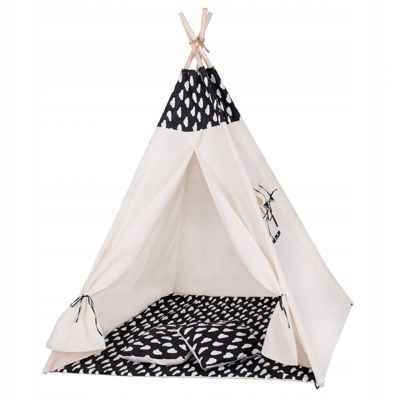 Corturile stil indian Teepee Tent sunt cele mai la moda locuri de joaca in camerele copiilor, iar in zilele insorite de vara vor fi perfecte si in gradina sau pe terasa. Acestea va vor permite sa dezvoltati imaginatia celor mai tineri membri ai familiei in timp ce se vor juca cu fratii sau prietenii. Serile petrecute impreuna cu parintii pot fi diversificate ramanand inauntru in timp ce citesti basmele tale preferate.Productia acestui produs se caracterizeaza in primul rand prin sarguinta si grija pentru selectarea celor mai bune materiale. Tesatura din bumbac garanteaza circulatia aerului, iar umplutura din puf asigura confort in timp ce va jucati si va odihniti in interiorul cortului. Fereastra laterala are o ruleta care poate fi utilizata pentru a acoperi interiorul cortului in timpul unui pui de somn in timpul zilei. Corturile sunt potrivite pentru copii de toate varstele.Pentru a oferi cel mai mare confort posibil, salteaua este echipata cu garnituri antiaderente care, atunci cand sunt atasate de cadru, asigura ca materialul nu se misca. Pernele incluse in set sunt un accesoriu obligatoriu atunci cand petreceti timpul in cort. Copiii se pot odihni pe ele in timp ce asculta povesti sau cand se joaca.Cadrul este realizat din lemn de pin puternic. Lustruirea temeinica a betelor va asigura siguranta in timpul asamblarii si a jocului ulterior. Plierea si desfacerea cortului este extrem de simpla: conectati doi poli intre ei utilizand conectori puternici, apoi introduceti-i in tunelurile din material. Mai tarziu, este suficient sa legati betele impreuna si sa asezati in interior salteaua si pernele. In acest mod rapid si usor, puteti echipa camera unui copil cu un accesoriu nou.