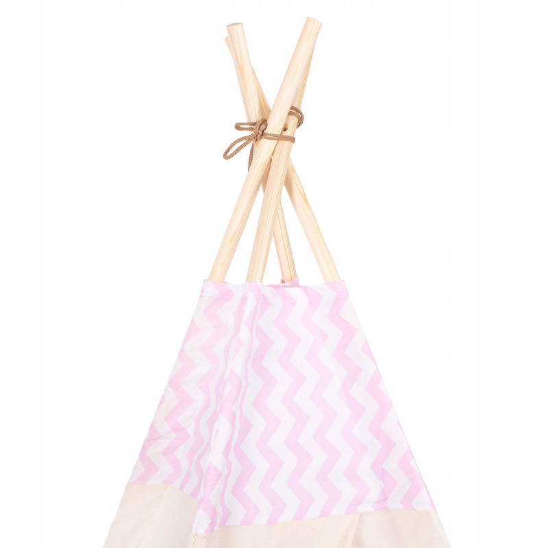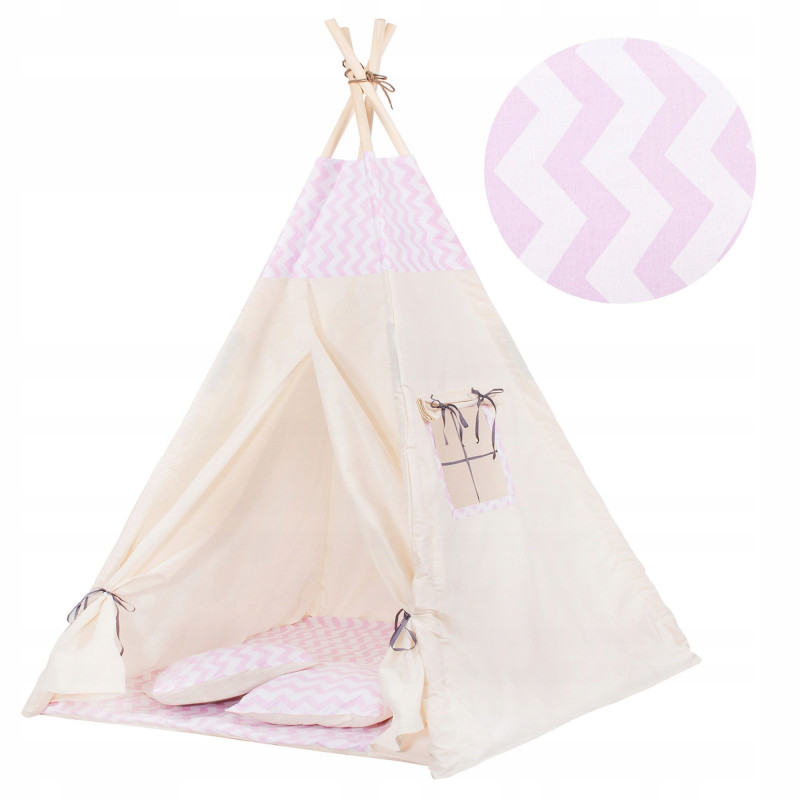 Corturile stil indian Teepee Tent sunt cele mai la moda locuri de joaca in camerele copiilor, iar in zilele insorite de vara vor fi perfecte si in gradina sau pe terasa. Acestea va vor permite sa dezvoltati imaginatia celor mai tineri membri ai familiei in timp ce se vor juca cu fratii sau prietenii. Serile petrecute impreuna cu parintii pot fi diversificate ramanand inauntru in timp ce citesti basmele tale preferate.Productia acestui produs se caracterizeaza in primul rand prin sarguinta si grija pentru selectarea celor mai bune materiale. Tesatura din bumbac garanteaza circulatia aerului, iar umplutura din puf asigura confort in timp ce va jucati si va odihniti in interiorul cortului. Fereastra laterala are o ruleta care poate fi utilizata pentru a acoperi interiorul cortului in timpul unui pui de somn in timpul zilei. Corturile sunt potrivite pentru copii de toate varstele.Pentru a oferi cel mai mare confort posibil, salteaua este echipata cu garnituri antiaderente care, atunci cand sunt atasate de cadru, asigura ca materialul nu se misca. Pernele incluse in set sunt un accesoriu obligatoriu atunci cand petreceti timpul in cort. Copiii se pot odihni pe ele in timp ce asculta povesti sau cand se joaca.Cadrul este realizat din lemn de pin puternic. Lustruirea temeinica a betelor va asigura siguranta in timpul asamblarii si a jocului ulterior. Plierea si desfacerea cortului este extrem de simpla: conectati doi poli intre ei utilizand conectori puternici, apoi introduceti-i in tunelurile din material. Mai tarziu, este suficient sa legati betele impreuna si sa asezati in interior salteaua si pernele. In acest mod rapid si usor, puteti echipa camera unui copil cu un accesoriu nou.
