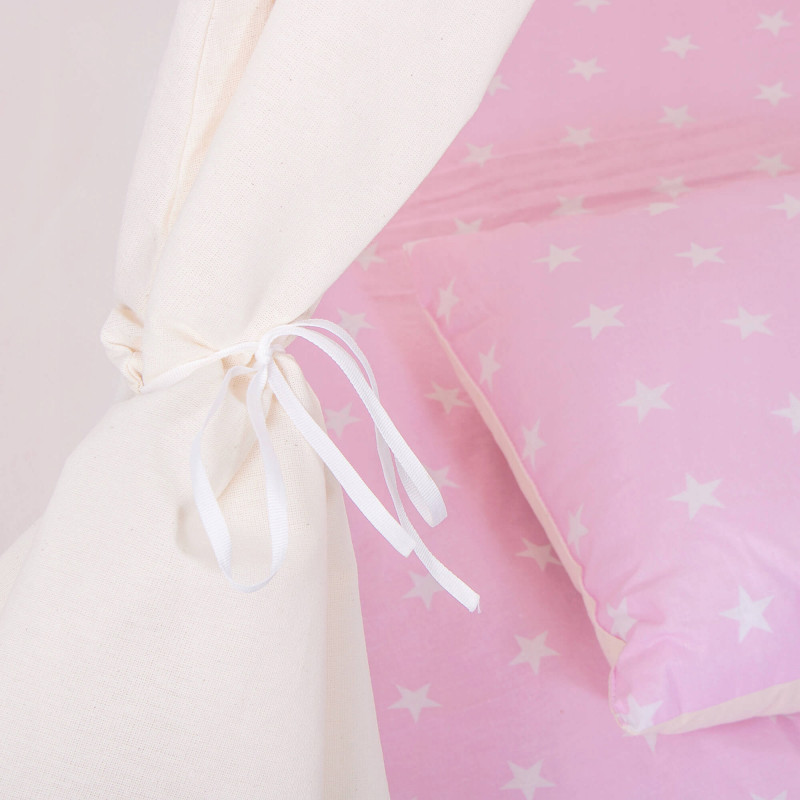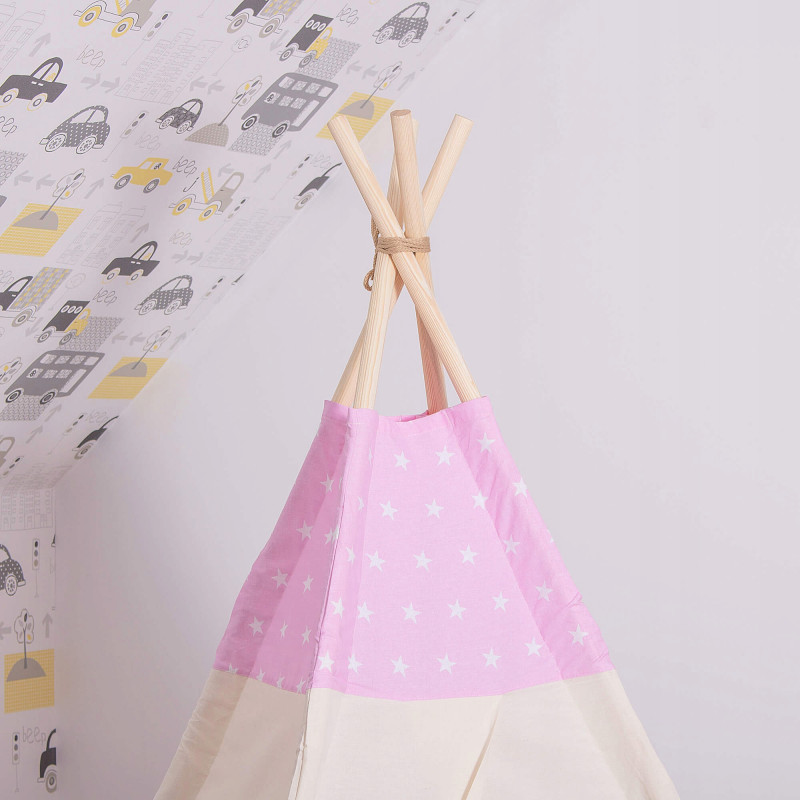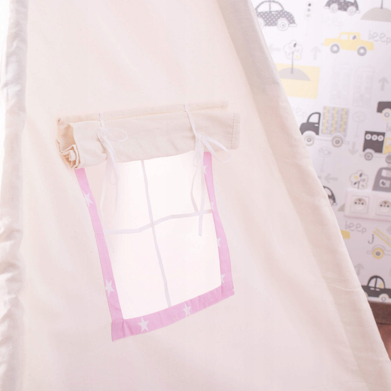 Corturile stil indian Teepee Tent sunt cele mai la moda locuri de joaca in camerele copiilor, iar in zilele insorite de vara vor fi perfecte si in gradina sau pe terasa. Acestea va vor permite sa dezvoltati imaginatia celor mai tineri membri ai familiei in timp ce se vor juca cu fratii sau prietenii. Serile petrecute impreuna cu parintii pot fi diversificate ramanand inauntru in timp ce citesti basmele tale preferate.Productia acestui produs se caracterizeaza in primul rand prin sarguinta si grija pentru selectarea celor mai bune materiale. Tesatura din bumbac garanteaza circulatia aerului, iar umplutura din puf asigura confort in timp ce va jucati si va odihniti in interiorul cortului. Fereastra laterala are o ruleta care poate fi utilizata pentru a acoperi interiorul cortului in timpul unui pui de somn in timpul zilei. Corturile sunt potrivite pentru copii de toate varstele.Pentru a oferi cel mai mare confort posibil, salteaua este echipata cu garnituri antiaderente care, atunci cand sunt atasate de cadru, asigura ca materialul nu se misca. Pernele incluse in set sunt un accesoriu obligatoriu atunci cand petreceti timpul in cort. Copiii se pot odihni pe ele in timp ce asculta povesti sau cand se joaca.Cadrul este realizat din lemn de pin puternic. Lustruirea temeinica a betelor va asigura siguranta in timpul asamblarii si a jocului ulterior. Plierea si desfacerea cortului este extrem de simpla: conectati doi poli intre ei utilizand conectori puternici, apoi introduceti-i in tunelurile din material. Mai tarziu, este suficient sa legati betele impreuna si sa asezati in interior salteaua si pernele. In acest mod rapid si usor, puteti echipa camera unui copil cu un accesoriu nou.