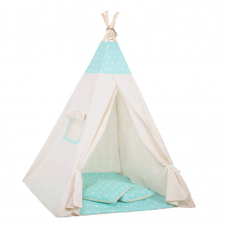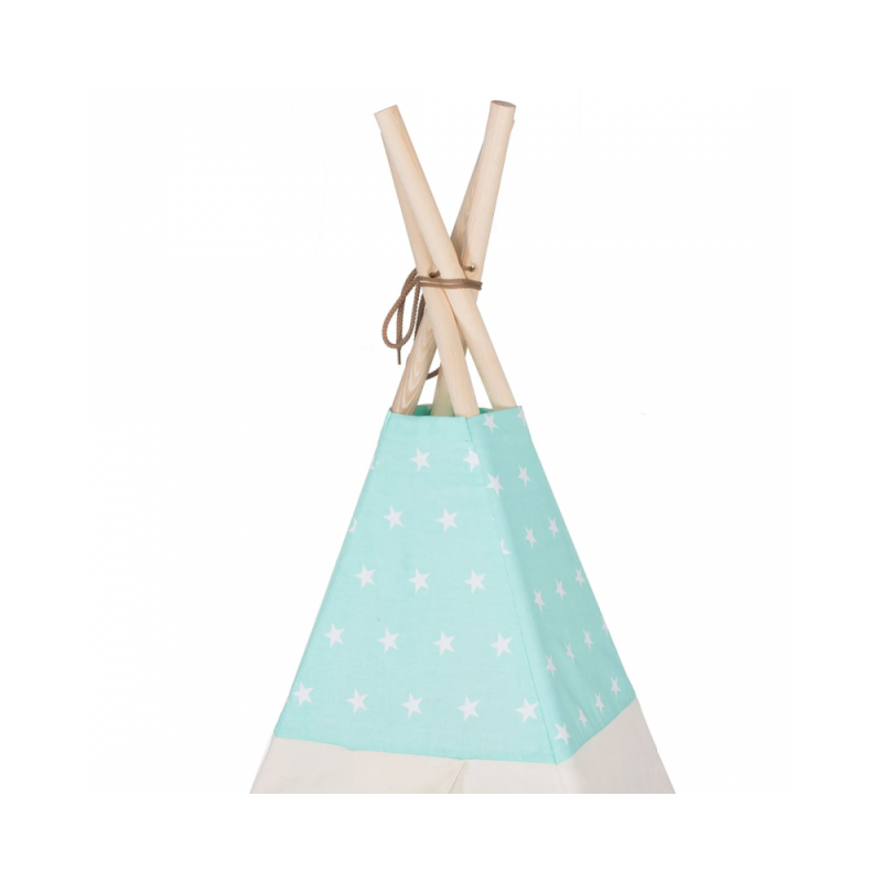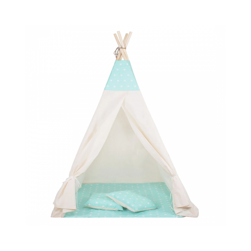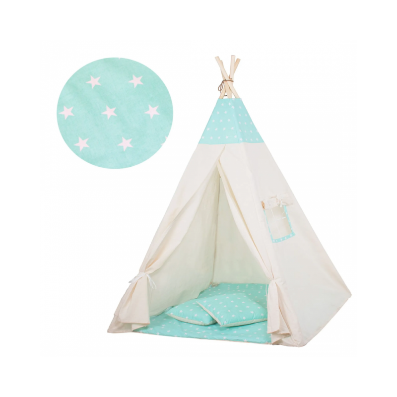 Corturile stil indian Teepee Tent sunt cele mai la moda locuri de joaca in camerele copiilor, iar in zilele insorite de vara vor fi perfecte si in gradina sau pe terasa. Acestea va vor permite sa dezvoltati imaginatia celor mai tineri membri ai familiei in timp ce se vor juca cu fratii sau prietenii. Serile petrecute impreuna cu parintii pot fi diversificate ramanand inauntru in timp ce citesti basmele tale preferate.Productia acestui produs se caracterizeaza in primul rand prin sarguinta si grija pentru selectarea celor mai bune materiale. Tesatura din bumbac garanteaza circulatia aerului, iar umplutura din puf asigura confort in timp ce va jucati si va odihniti in interiorul cortului. Fereastra laterala are o ruleta care poate fi utilizata pentru a acoperi interiorul cortului in timpul unui pui de somn in timpul zilei. Corturile sunt potrivite pentru copii de toate varstele.Pentru a oferi cel mai mare confort posibil, salteaua este echipata cu garnituri antiaderente care, atunci cand sunt atasate de cadru, asigura ca materialul nu se misca. Pernele incluse in set sunt un accesoriu obligatoriu atunci cand petreceti timpul in cort. Copiii se pot odihni pe ele in timp ce asculta povesti sau cand se joaca.Cadrul este realizat din lemn de pin puternic. Lustruirea temeinica a betelor va asigura siguranta in timpul asamblarii si a jocului ulterior. Plierea si desfacerea cortului este extrem de simpla: conectati doi poli intre ei utilizand conectori puternici, apoi introduceti-i in tunelurile din material. Mai tarziu, este suficient sa legati betele impreuna si sa asezati in interior salteaua si pernele. In acest mod rapid si usor, puteti echipa camera unui copil cu un accesoriu nou.