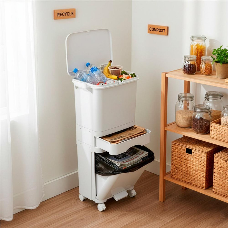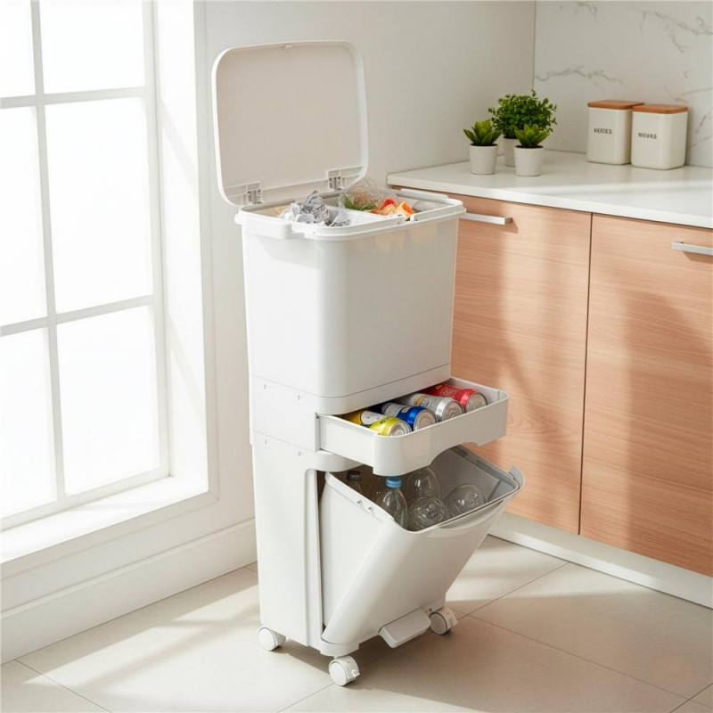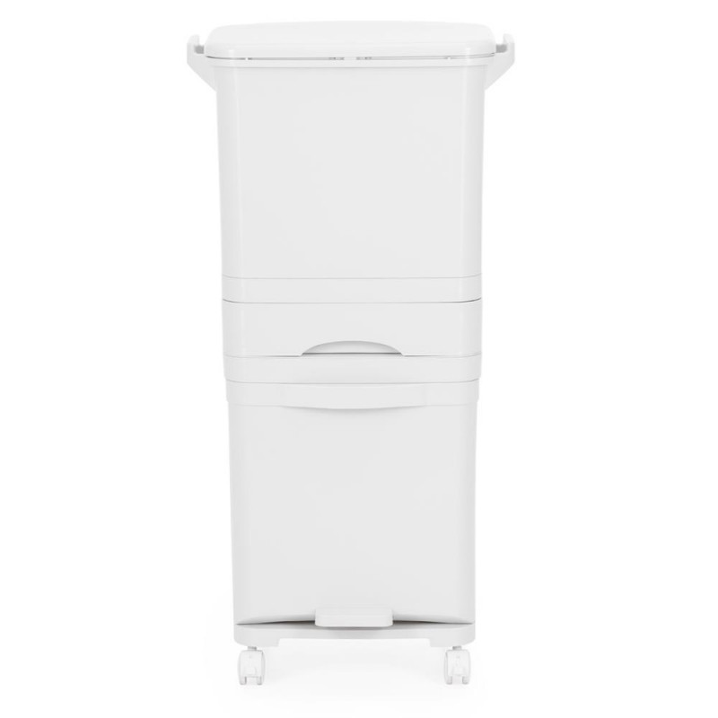Scurta descriere: Cos de gunoi pentru colectare selectiva, prevazut cu trei compartimente functionale. Compartimentul superior se deschide cu clapeta, sertarul central este culisant, iar compartimentul inferior se actioneaza cu pedala. Dotat cu roti cu blocare pentru deplasare usoara si stabilitate.