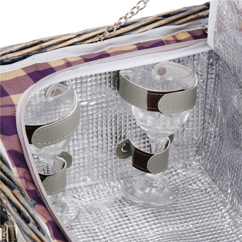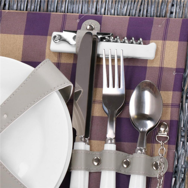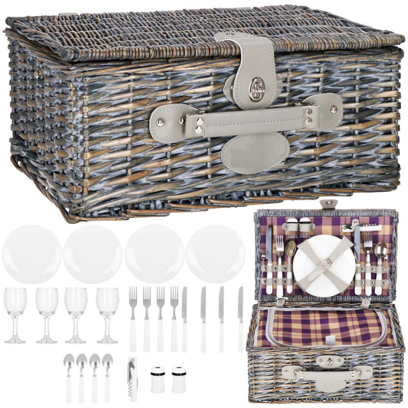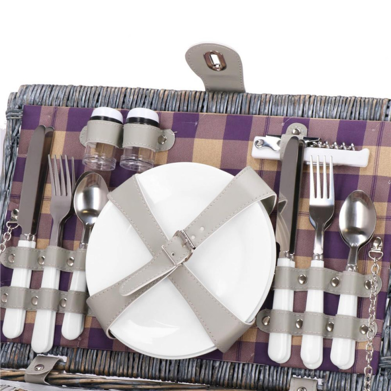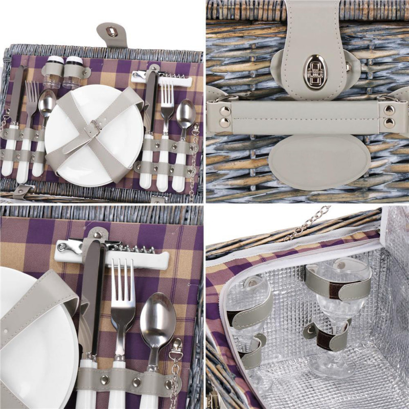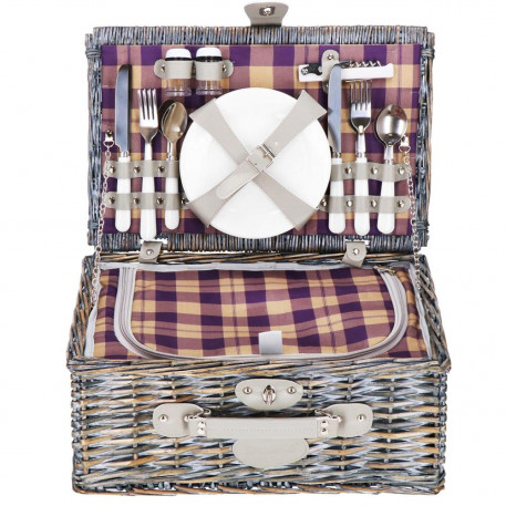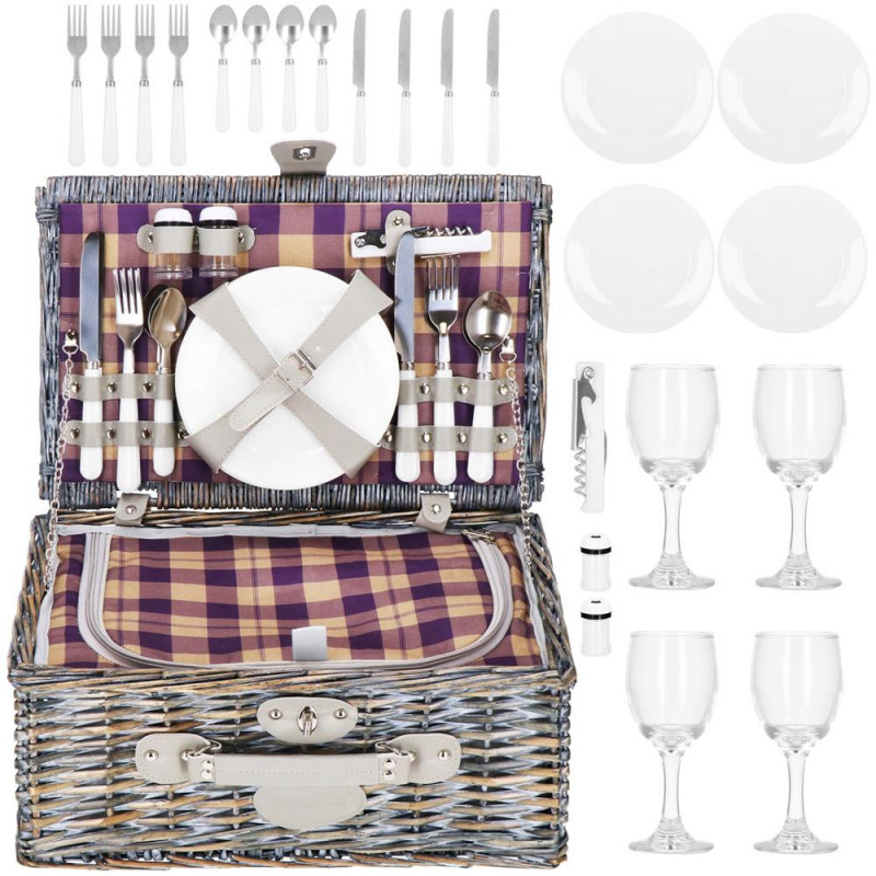 Maner confortabil de tip "valiza". Cosul de picnic este dotat cu toate accesoriile de care ai nevoie pentru a te bucura de o masa cu familia si prietenii in aer liber. Veti gasi un set de tacamuri, farfurii si pahare pentru patru persoane! De asemenea, nu am uitat de lucruri mici atat de utile precum un deschizator de tirbuson si recipiente pentru sare si piper. Nu mai trebuie sa va amintiti sa cumparati accesorii de unica folosinta! Echipamentul nostru este durabil si reutilizabil.