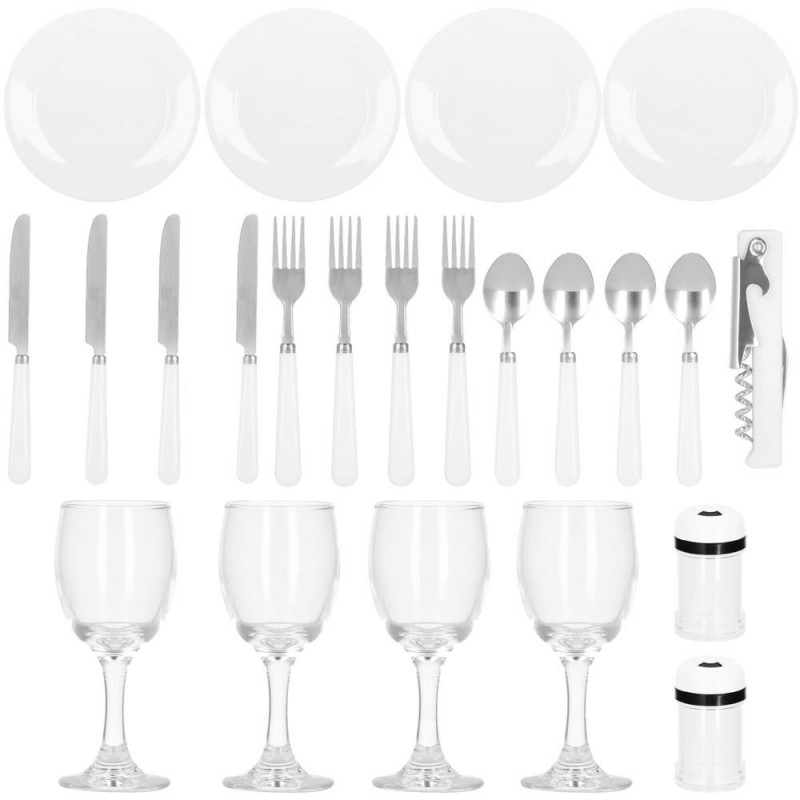 Are tot echipamentul necesar pentru 4 persoane - tacamuri, farfurii si alte articole utile.