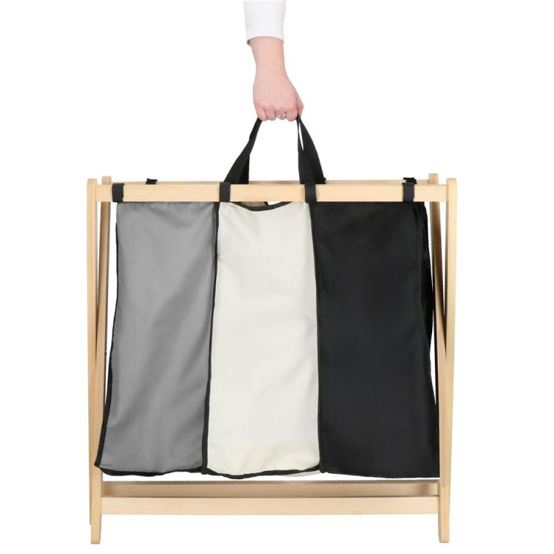 Dimensiuni 55 x 43 x 67 cm Cosul de rufe cu trei compartimente si usor este o optiune excelenta pentru a completa o baie moderna. Produsul nu numai ca arata extrem de impresionant si modern, este si un plus practic si functional la interior, care cu siguranta va va usura treburile gospodaresti de zi cu zi.Cosul nostru de rufe cu trei compartimente este extrem de practic. Il puteti plia atunci cand este gol pentru o depozitare usoara. De asemenea, permite detasarea cadrului din camere, astfel incat camerele din material sa poata fi spalate. Cadrul in sine este usor, din lemn natural si usor de transportat.In practica, cosul nostru, care permite si separarea rufelor, este o solutie ideala pentru persoanele care pretuiesc articolele simple care usureaza viata de zi cu zi.Camerele din poliester ale sacului de rufe sunt durabile, rezistente la umiditate si isi vor pastra culorile pentru o lunga perioada de timp . Interiorul lor este acoperit cu un strat care este stralucitor in cazul contactului cu hainele umede - nu se va inmuia. Aceste tipuri de materiale sunt foarte usor de pastrat curate.Un cadru din lemn este un mare avantaj. Este usor, are o constructie simpla care se pliaza usor si nu ocupa mult spatiu cand este pliat.