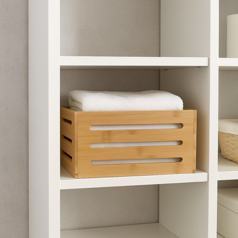 Scurta descriere Cosul de depozitare din bambus masiv ofera o solutie eleganta si functionala pentru organizarea obiectelor mici. Cu un design compact si finisaj maro natural, se integreaza perfect pe rafturi sau in mobilierul deschis din baie, bucatarie sau dressing.
