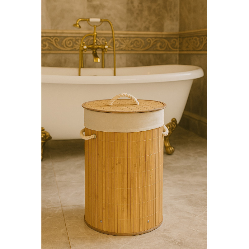 Scurta descriere Cosul de rufe rotund Bambou de la 5 Five imbina naturaletea bambusului cu functionalitatea textilului din poliester. Cu o capacitate de 48 litri si un design cald, este perfect pentru organizarea rufelor in baie sau dormitor.