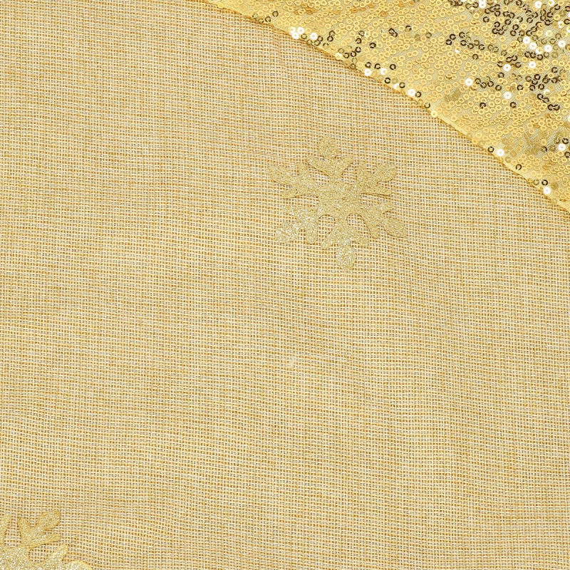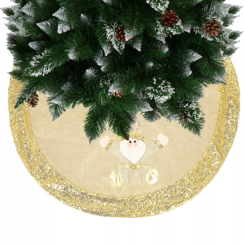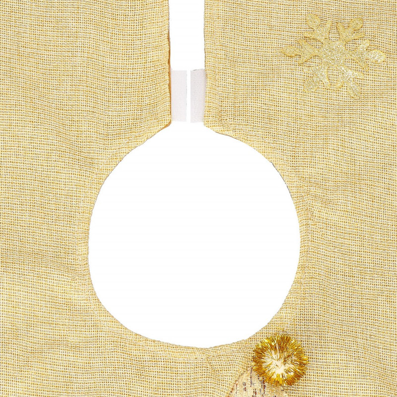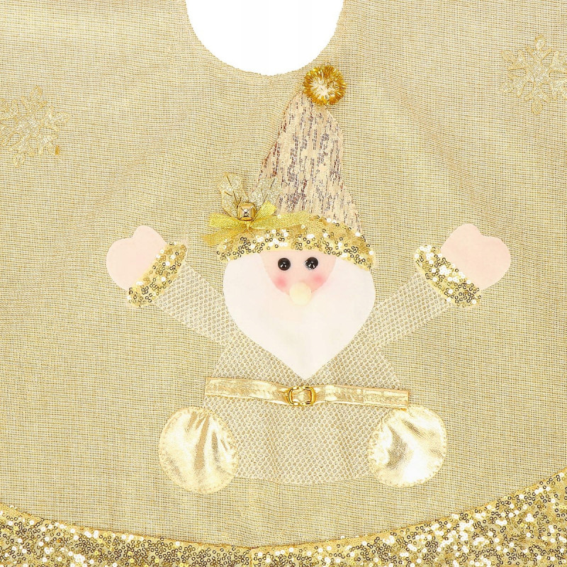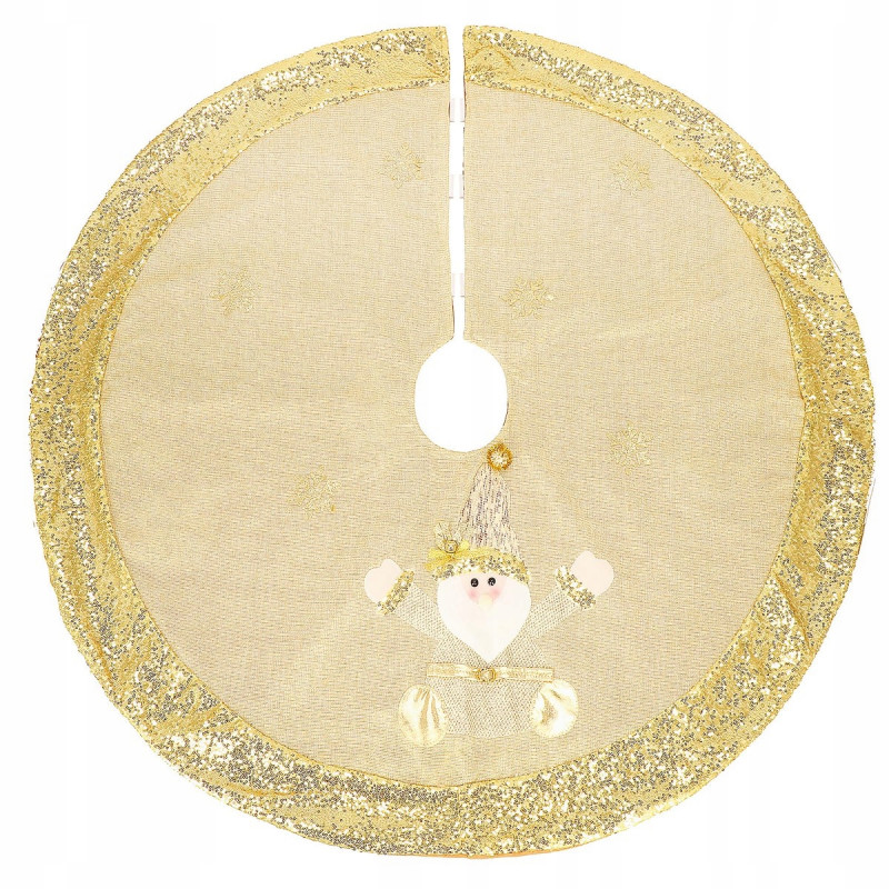 Asociem Craciunul in principal cu un brad frumos si bogat impodobit, asa ca sa ne preocupam si de decorul de sub el. Covorasul va fi accesoriul perfect pentru a aduce o atmosfera de sarbatoare in casa ta. Va fi perfect ca covor pentru cadouri sau va acoperi un suport inestetic pentru brad. Covorasul de 106 cm este confectionat din tesatura aurie. Sf. Mos Craciun cu barba alba in tinuta aurie cu paiete si sapca cu clopotel de care este atasat un pompon auriu. Intregul covoras este decorat cu un chenar din paiete aurii. Covorul este prins cu trei velcro albe, care sunt practic invizibile dupa prindere. Covorasul este un accesoriu decorativ ideal care nu numai ca va infrumuseta locul pentru cadouri si va acoperi suportul pentru pomul de Craciun, dar si va face decorul casei tale cald si confortabil.