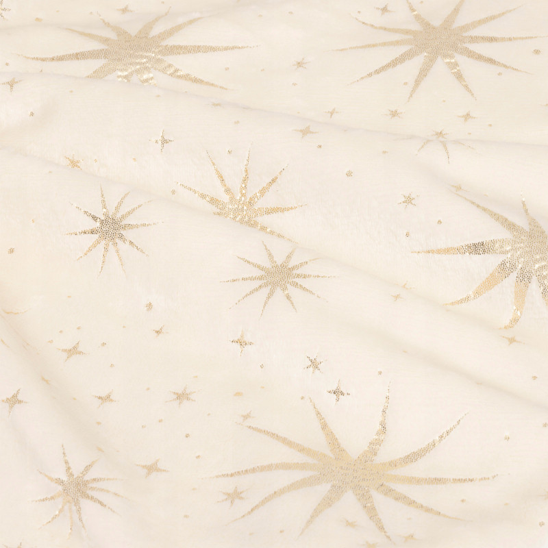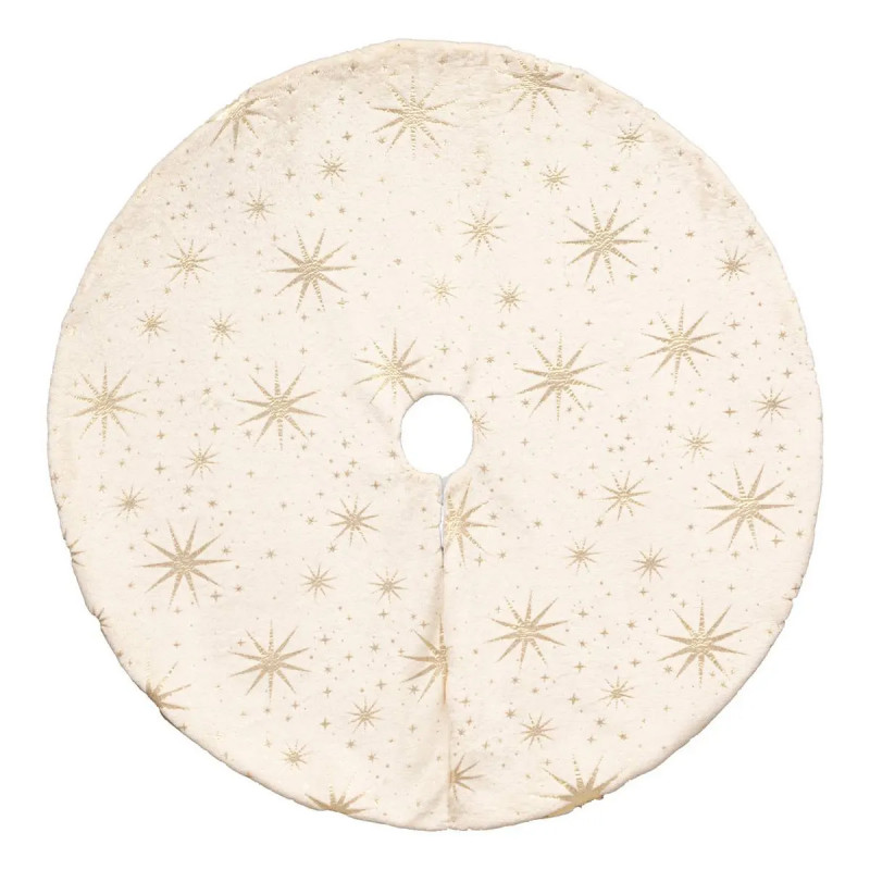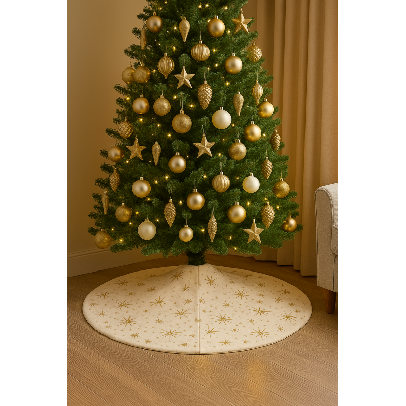 Scurta descriere Covorul decorativ pentru brad aduce o nota rafinata si eleganta decorului de sarbatoare. Cu un design in nuante ivoire, presarat cu stele aurii, completeaza perfect un brad decorat in stil clasic sau modern. Ideal pentru a ascunde suportul bradului si a oferi o prezentare festiva impecabila.