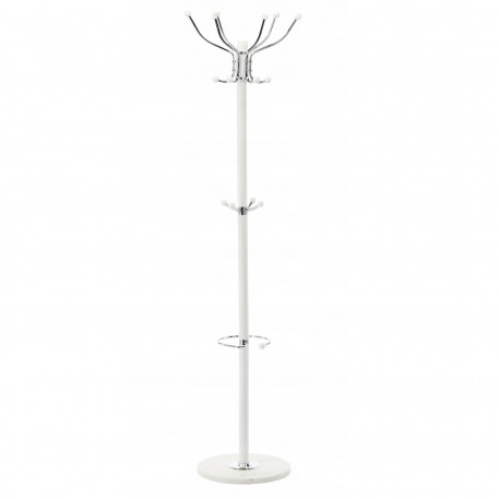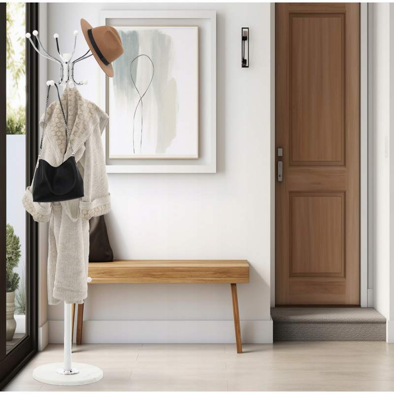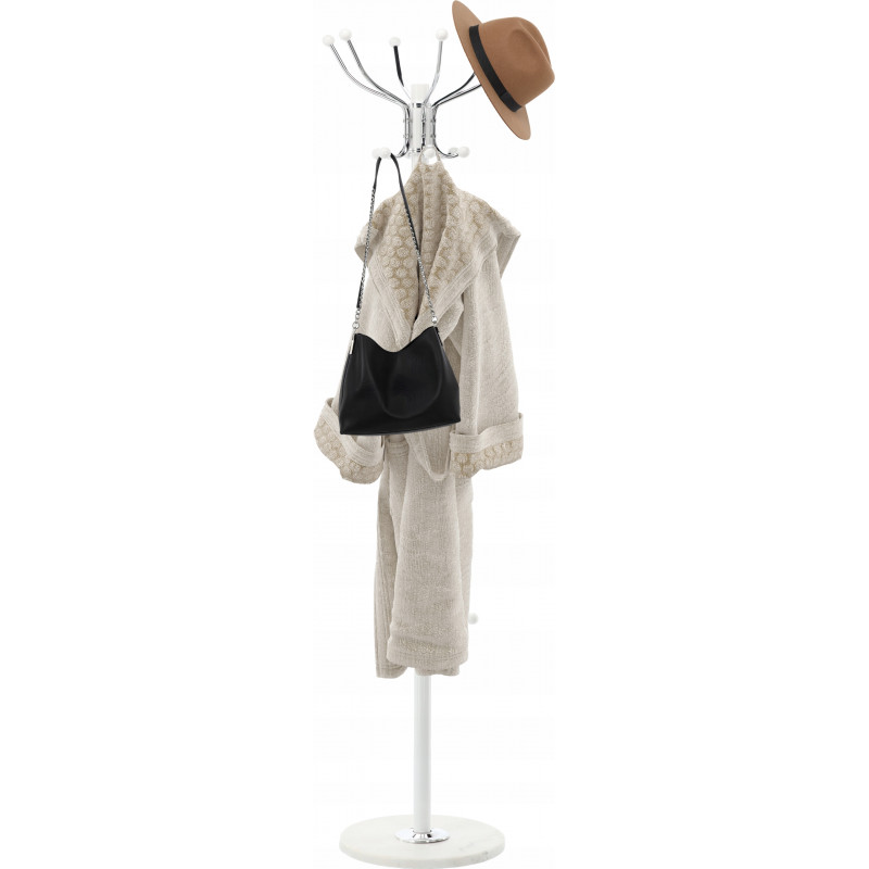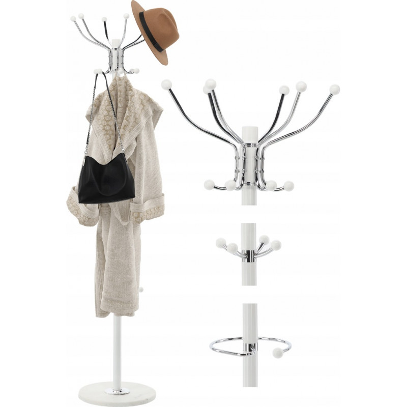 Material: Metal combinat cu o baza de piatra - asigura durabilitate si stabilitate. Cuierul de sine statator combina functionalitatea cu eleganta. Portabilitatea sa usoara il face sa se potriveasca perfect intr-o varietate de spatii – holuri, dressinguri sau vestiare. Designul sau modern pune in valoare orice interior, adaugand o nota chic.Carligul ofera un spatiu de depozitare convenabil pentru paltoane, jachete, esarfe si genti de mana. Una dintre trasaturile distinctive ale cuierului este baza sa din piatra care imita marmura, care nu numai ca atrage privirea, dar asigura si o stabilitate exceptionala, chiar si la sarcini mai mari. In ciuda usurintei vizuale, cuierul este solid si durabil, iar designul sau bine gandit permite multi ani de utilizare.Carligul de sine statator are multe manere solide care ofera un spatiu de depozitare convenabil pentru mai multe articole de imbracaminte in acelasi timp. Carlige faciliteaza agatarea paltoanelor, jachetelor, esarfelor si gentilor de mana, organizand spatiul ordonat si functional. Fiecare maner este stabil si solid, asigurand ca umerasul va tine chiar si articole de imbracaminte mai grele, fara a-si pierde forma eleganta.Cuierul se distinge prin culoarea sa universala, care se potriveste perfect cu o varietate de stiluri interioare – de la modern la clasic. Cu designul sau minimalist, dar elegant, cuierul se potriveste perfect atat in camere luminoase, spatioase, cat si in aranjamente mai discrete, confortabile. Negrul ii confera un aspect vizual usor, care evita efectul de a fi coplesitor chiar si in spatii mai mici.