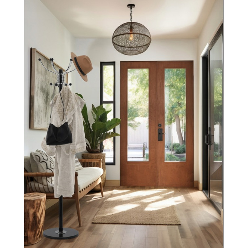 Material: Metal combinat cu o baza de piatra - asigura durabilitate si stabilitate. Cuierul de sine statator combina functionalitatea cu eleganta. Portabilitatea sa usoara il face sa se potriveasca perfect intr-o varietate de spatii – holuri, dressinguri sau vestiare. Designul sau modern pune in valoare orice interior, adaugand o nota chic.Carligul ofera un spatiu de depozitare convenabil pentru paltoane, jachete, esarfe si genti de mana. Una dintre trasaturile distinctive ale cuierului este baza sa din piatra care imita marmura, care nu numai ca atrage privirea, dar asigura si o stabilitate exceptionala, chiar si la sarcini mai mari. In ciuda usurintei vizuale, cuierul este solid si durabil, iar designul sau bine gandit permite multi ani de utilizare.Carligul de sine statator are multe manere solide care ofera un spatiu de depozitare convenabil pentru mai multe articole de imbracaminte in acelasi timp. Carlige faciliteaza agatarea paltoanelor, jachetelor, esarfelor si gentilor de mana, organizand spatiul ordonat si functional. Fiecare maner este stabil si solid, asigurand ca umerasul va tine chiar si articole de imbracaminte mai grele, fara a-si pierde forma eleganta.Cuierul se distinge prin culoarea sa universala, care se potriveste perfect cu o varietate de stiluri interioare – de la modern la clasic. Cu designul sau minimalist, dar elegant, cuierul se potriveste perfect atat in camere luminoase, spatioase, cat si in aranjamente mai discrete, confortabile. Negrul ii confera un aspect vizual usor, care evita efectul de a fi coplesitor chiar si in spatii mai mici.