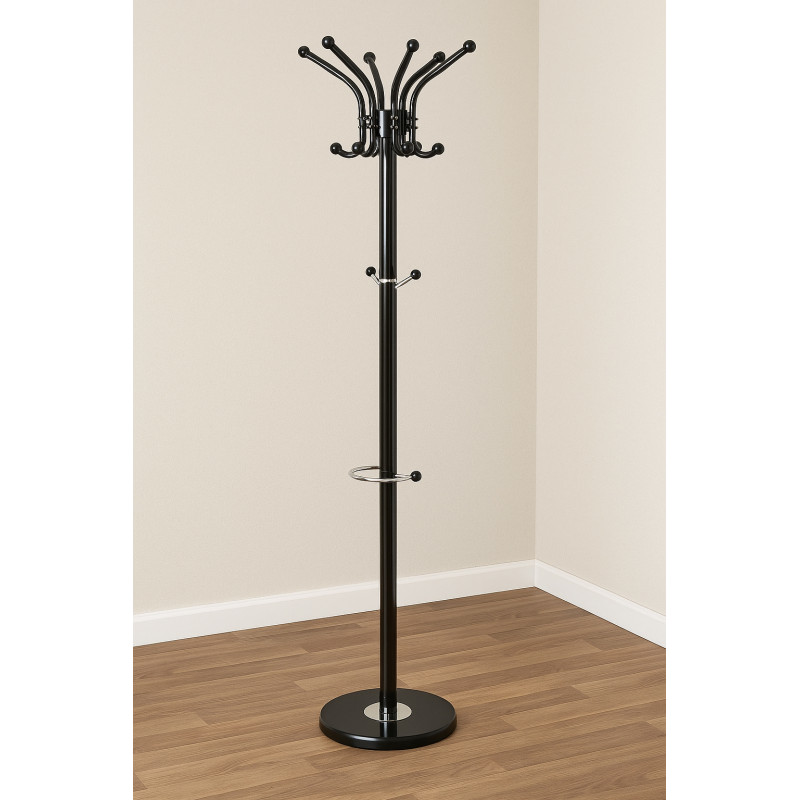 Scurta descriere Cuierul metalic de la 5 Five combina functionalitatea cu eleganta prin designul sau modern, realizat din otel negru si baza solida din marmura. Cu 12 carlige si un suport dedicat pentru umbrele, este perfect pentru holuri, birouri sau spatii de primire.