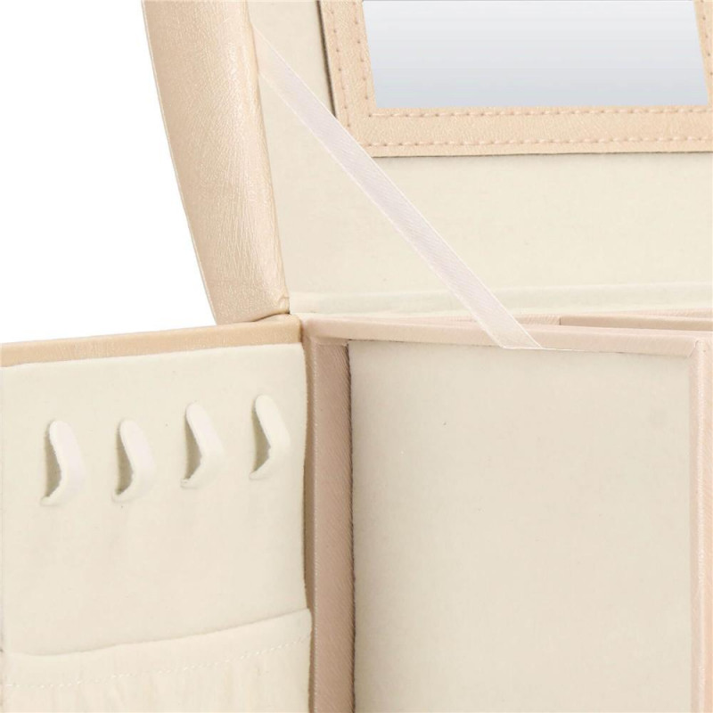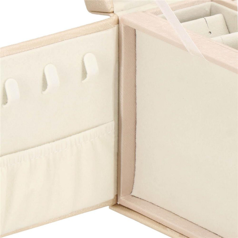 In interiorul cutiei: oglinda3 compartimente - 1 pentru inele si 2 cercei2 sertare - 1 dintre ele cu 4 compartimente (detasabil)3 compartimente cu suport pentru cercei2 compartimente laterale pentru bratari si lanturi Peretii laterali care se deschid ai carcasei: 4 suporturi pentru bratari si lanturi1 buzunar fiecare cu banda elasticadimensiuni: 13,5 x 10 cm