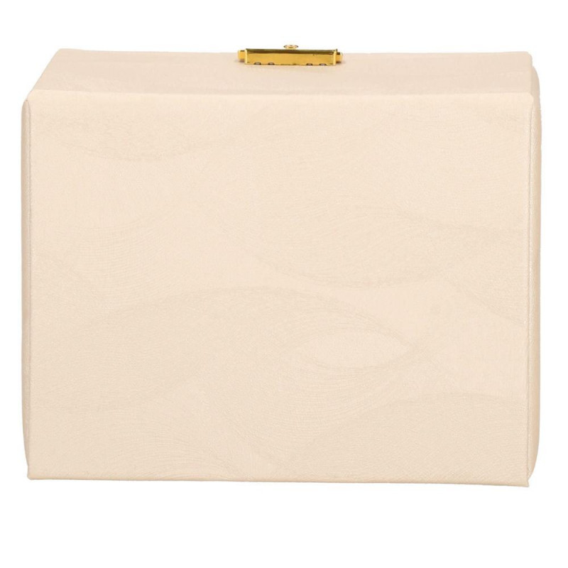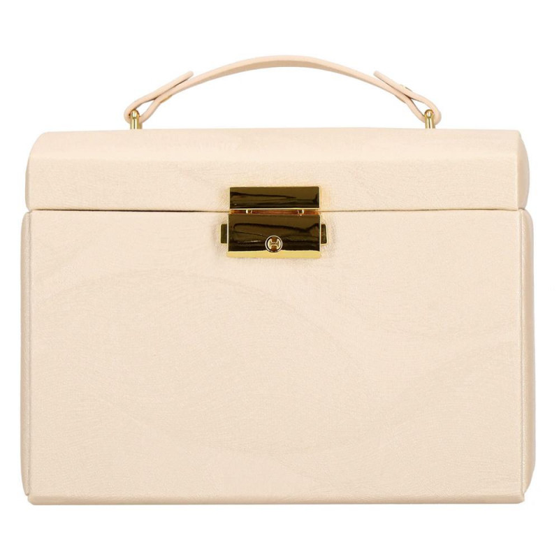 Informatii suplimentare: material exterior: piele ecologicamaterial interior: velurconstructie: MDFculoarea carcasei: cremfinisaj: sidefat, cu texturaculoarea elementului de fixare si a fitingurilor: auriuculoare interioara: creminterior din piele intoarsamaner de transporttip de inchidere: inchidere cu cheie dubla