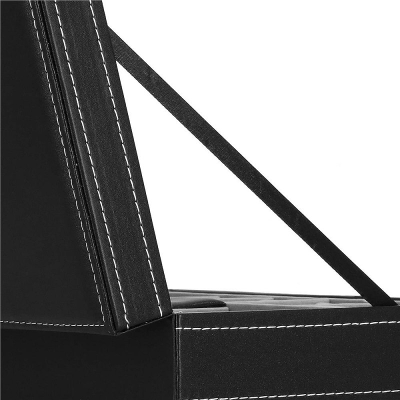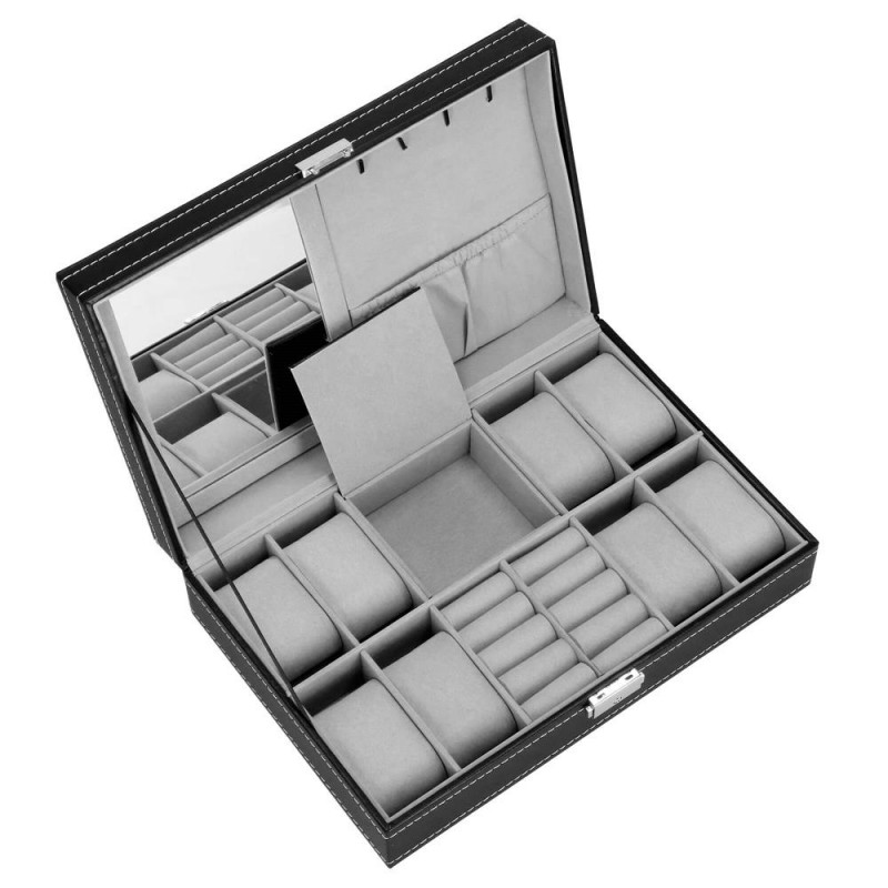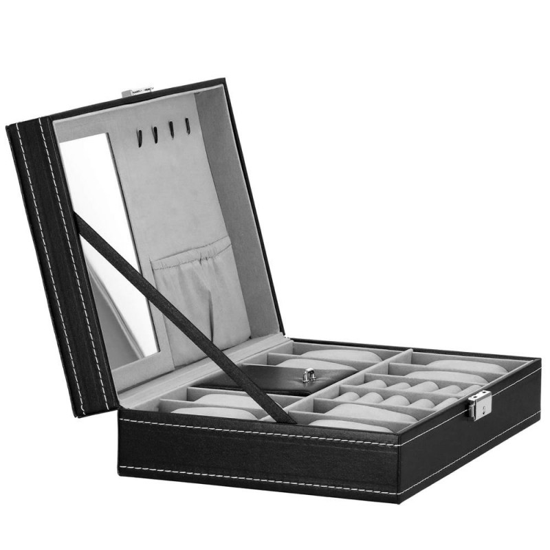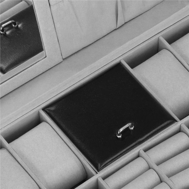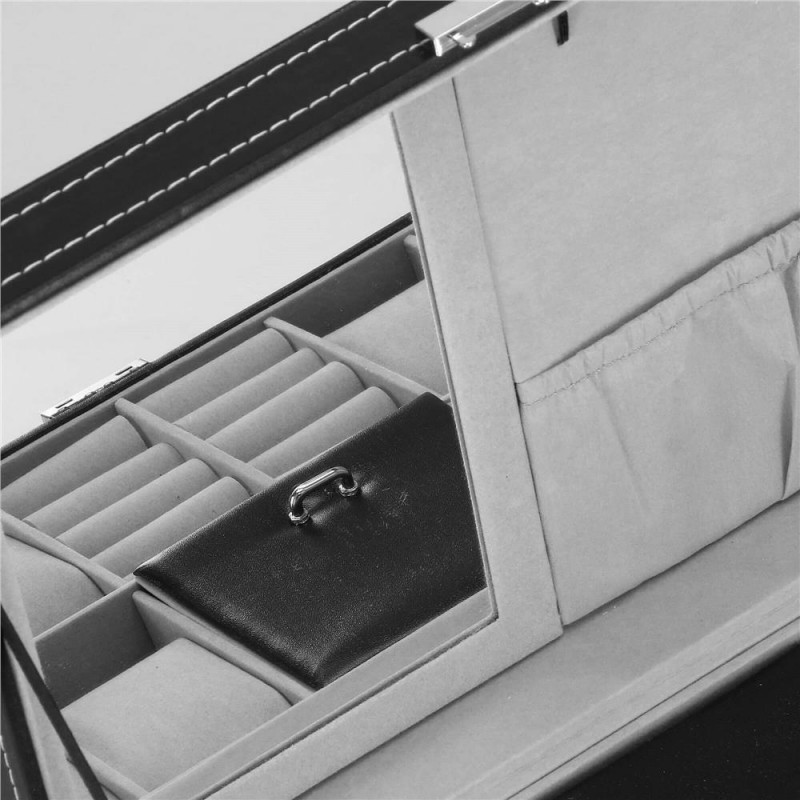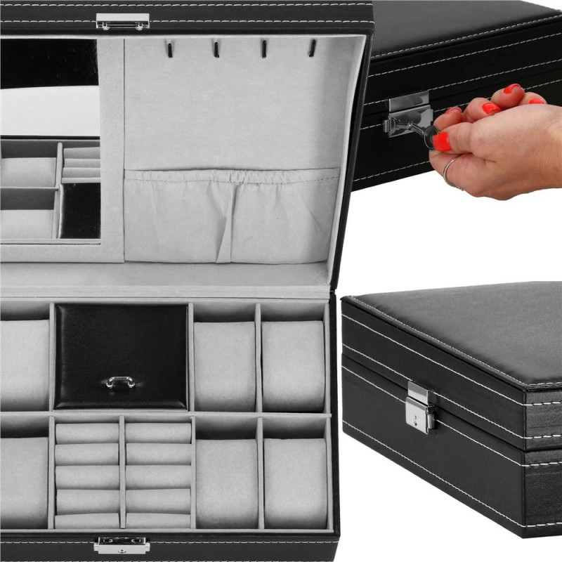 In plus: oglinda 11 x 16 cm4 suporturi pentru coliere si bratari, cu un buzunar cu cordon dedesubt2 compartimente pentru inele, butoni si cercei Compartiment blocabil cu clapadimensiunile compartimentelor pentru ceasuri si butoni: 4,5 x 9 cmdimensiunile compartimentului cu clapa: 9 x 9 cm