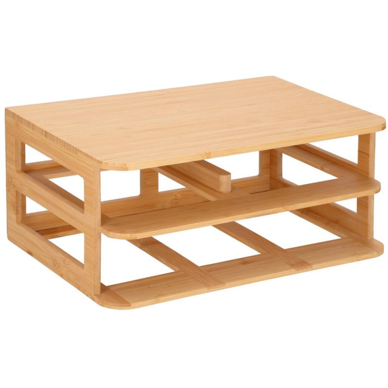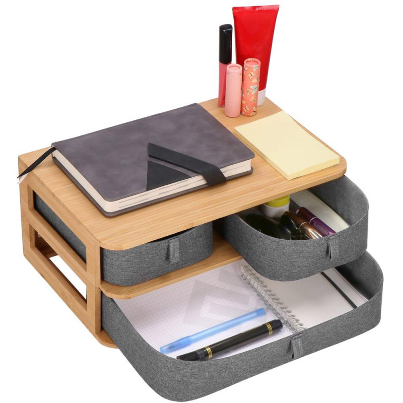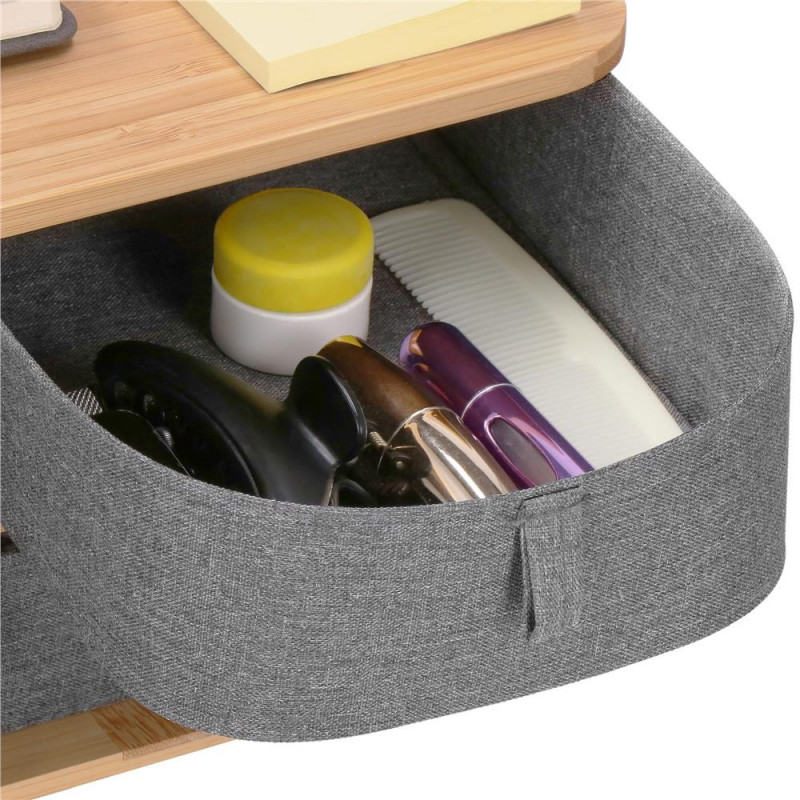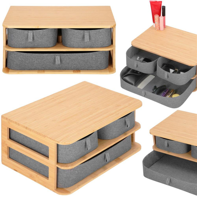 Dimensiuni sertar: sertar inferior - mare: 32 x 20,5 x 6 cm; sertare superioare - mici: 15,5 x 20,5 x 6 cm Elementele organizatorului nostru includ trei sertare (doua mai mici si unul mai mare). Aceasta diviziune va permite sa depozitati diverse articole, cum ar fi bijuterii sau rechizite de birou. Sunt perfecte pentru camera unui copil pentru a sorta jucariile mici precum figurinele sau accesoriile de arta. De asemenea, pot fi folosite pentru a depozita produse cosmetice in baie.Un organizator din bambus este, de asemenea, un element frumos care merita afisat intr-un loc vizibil - pe un birou, pe un raft, pe o comoda. Datorita utilizarii materialelor de inalta calitate si a culorilor universale, va adauga farmec oricarui interior. Bambusul natural adauga caldura si eleganta oricarei incaperi. Produsul este confectionat din bambus si tesatura rigida.