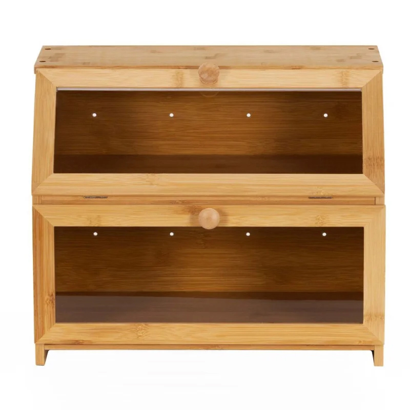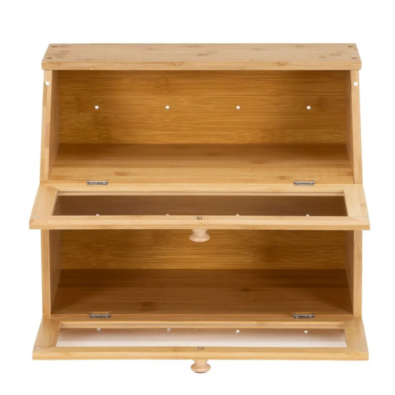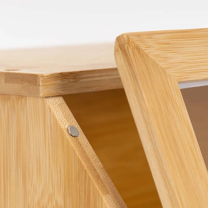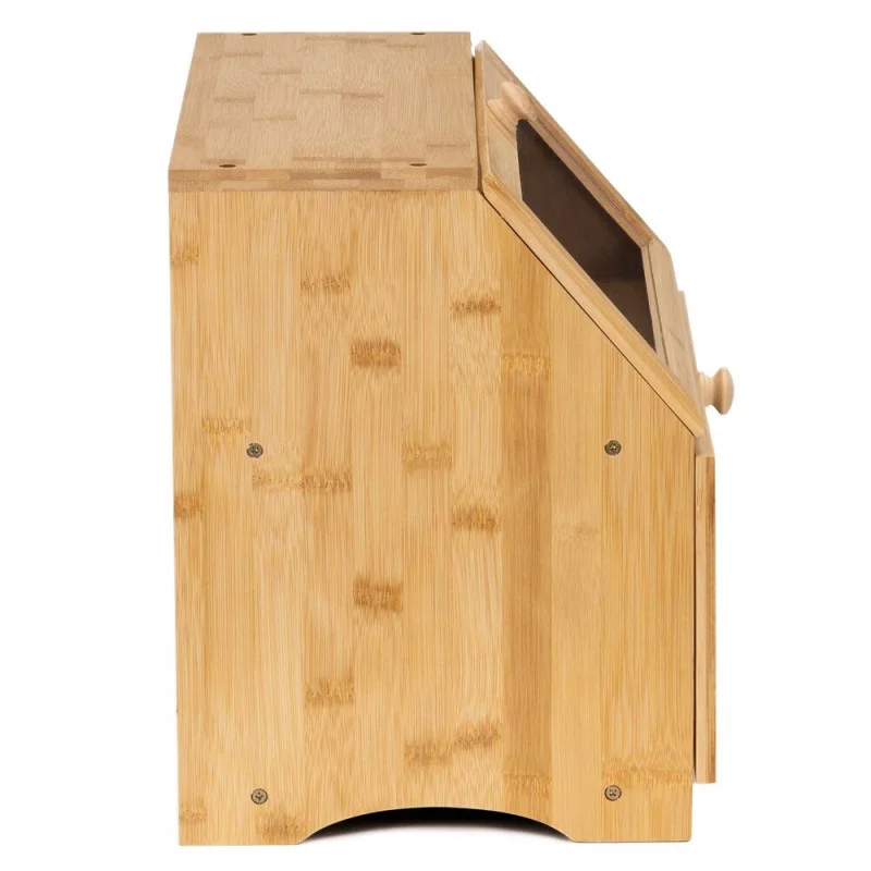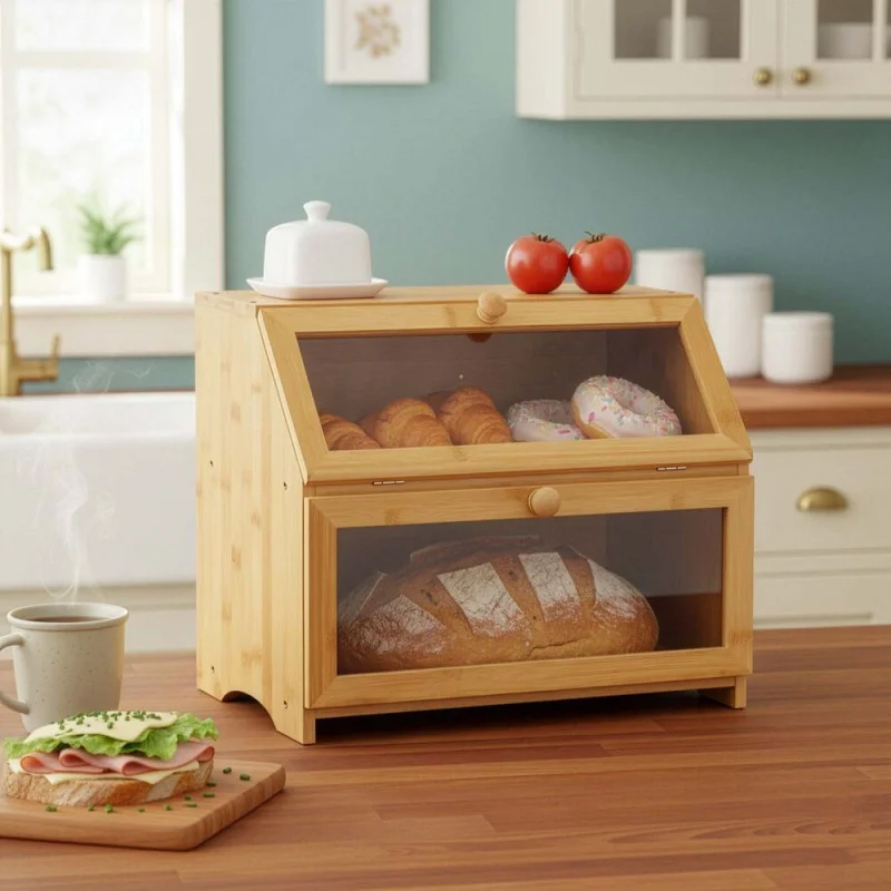 Scurta descriere: Cutia pentru paine cu doua niveluri permite depozitarea organizata a painii si a produselor de panificatie, contribuind la mentinerea prospetimii acestora pentru mai mult timp. Constructia din bambus este potrivita pentru contactul cu alimentele, iar ferestrele acrilice transparente permit verificarea continutului fara deschidere. Designul natural se potriveste usor in orice bucatarie.