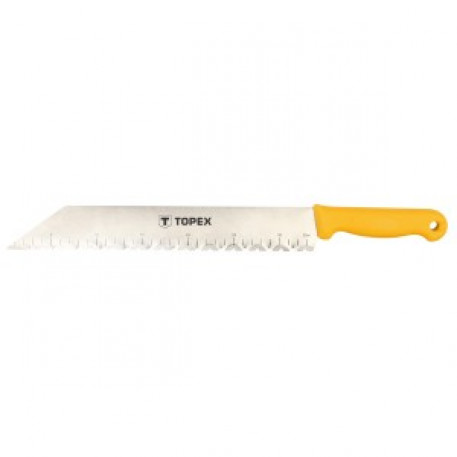 Cutit pentru vata minerala TOPEX, cu lungimea de 480 mm. Proiectat pentru taierea vatei minerale sau polistiren spuma rigida. Lama cu lungime 335 mm, cu dinti unilaterali are o scala metrica. Maner ergonomic din material plastic rezistent. Marca TOPEX se adreseaza mesterilor.
