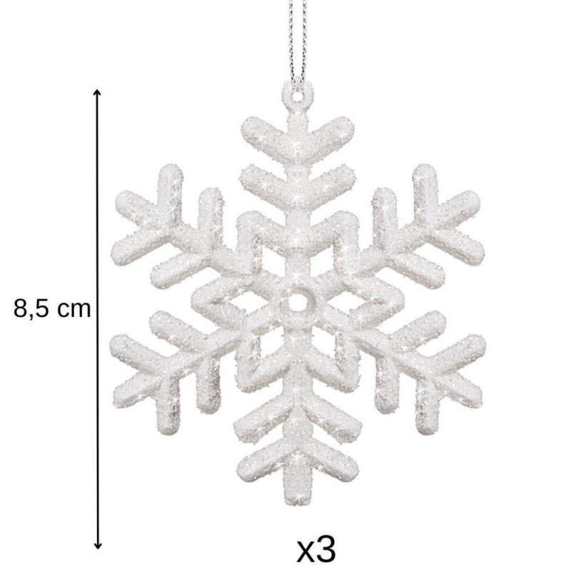 Lungimea fulgului de zapada: aprox. 8,5 cm Craciunul, ca si intreaga perioada de iarna, este o perioada magica, plina de caldura si de o atmosfera unica, creata datorita unui spectacol de decoratiuni fabuloase si constelatii luminoase incantatoare. Pandantivele frumoase in forma de fulgi de zapada va vor decora frumos bradul de Craciun. Setul este format din 3 fulgi de zapada cu decupaje frumoase. Pandantivele sunt insotite de o sfoara pentru a le agata pe crengile bradului de Craciun.
