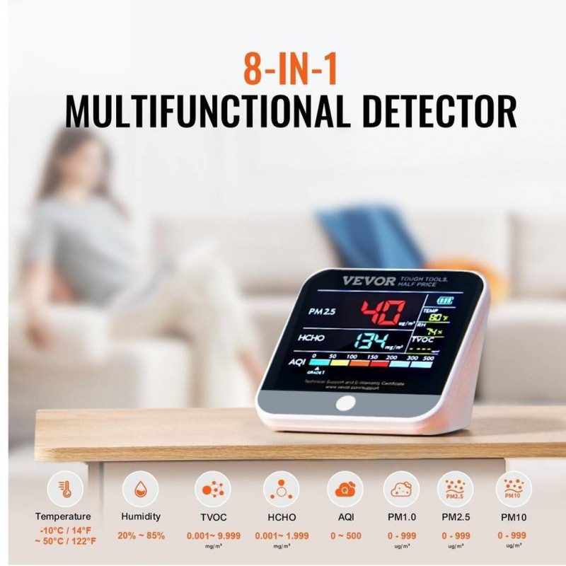 Detector calitate aer 8 in 1, AQI, PM1.0, PM2.5, PM10, TVOC,