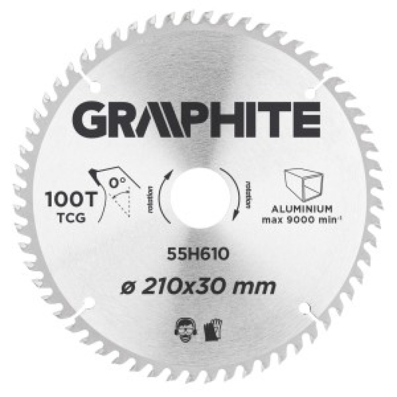 Disc de ferastrau cu placuta din aliaj dur GRAPHITE (cod 55H610) cu diametre 210 mm, realizat din aliaj de otel mangan MN65 cu rezistenta mare la temperatura si forma. Dintii cu placuta din aliaj dur YG6A permite la taierea voluminoasa pentru taiere de aluminiu. Incluse in ambalaj, inelele de reducere permite utilizarea discului pentru mai multe modele de fierastraie.