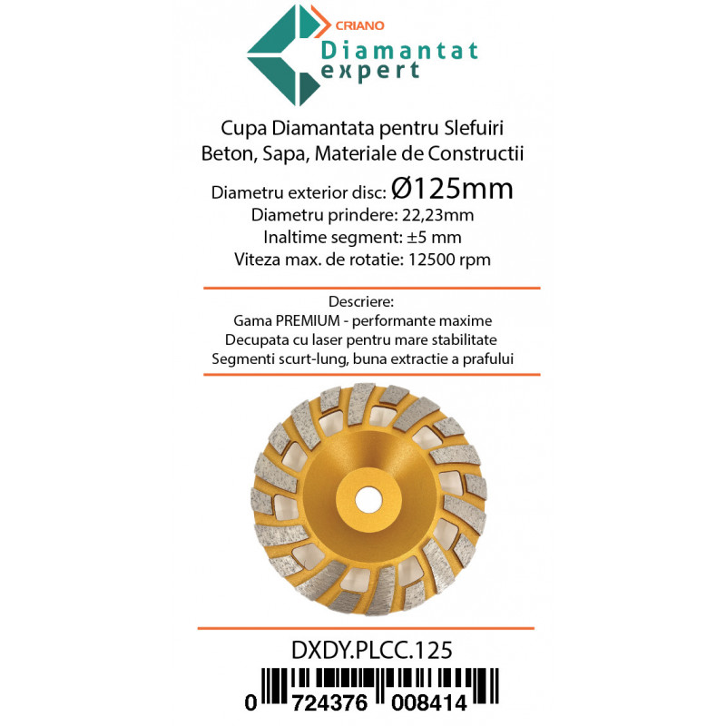 Disc cupa diamantata cu dinti alternativi pentru slefuire rapida de Beton si Abrazive 125mmx22,2mm PREMIUM - DXDY.PLCC.125