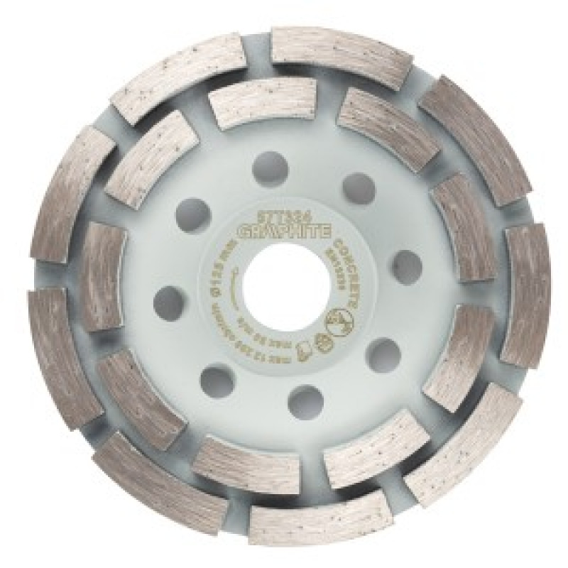 Disc abraziv diamantat GRAPHITE 57T324, 2 segmente, 125 x 22,2 mm, uscat 57T324 este echipat cu doua segmente si conceput pentru utilizare uscata. Inelele de reducere sunt incluse in set. Segmentele sunt caracterizate de o inaltime de 4,5 mm si o latime de 8 mm. Viteza maxima a discului GRAPHITE este de 12.200 rpm, echivalenta cu 80 m/s. Discul este conceput pentru slefuirea betonului, betonului celular, caramizii si pietrei. Gaurile din acest accesoriu imbunatatesc racirea in timpul lucrului si indeparteaza eficient praful si materialul abraziv. Acest lucru face ca slefuirea sa fie mai rapida si mai eficienta. Segmentele acoperite cu diamant asigura o slefuire eficienta si eficace. Acestea se uzeaza uniform, ceea ce garanteaza, de asemenea, o calitate constanta a lucrarii. Designul segmentat imbunatateste disiparea caldurii si previne supraincalzirea discului. Produsul GRAPHITE indeplineste cerintele EN 13236.