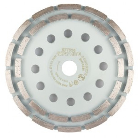 Disc abraziv diamantat GRAPHITE 57T325, 2 segmente, 180 x 22,2 mm, uscat 57T325 este echipat cu doua segmente si conceput pentru utilizare uscata. Inelele de reducere sunt incluse in set. Segmentele sunt caracterizate de o inaltime de 5 mm si o latime de 8 mm. Viteza maxima a discului GRAPHITE este de 8 600 rpm, echivalenta cu 80 m/s. Discul este conceput pentru slefuirea betonului, betonului celular, caramizii si pietrei. Gaurile din acest accesoriu imbunatatesc racirea in timpul functionarii si indeparteaza eficient praful si materialul abraziv. Acest lucru face ca slefuirea sa fie mai rapida si mai eficienta. Segmentele acoperite cu diamant asigura o slefuire eficienta si eficace. Acestea se uzeaza uniform, ceea ce garanteaza, de asemenea, o calitate constanta a lucrarii. Designul segmentat imbunatateste disiparea caldurii si previne supraincalzirea discului. Produsul GRAPHITE indeplineste cerintele EN 13236.