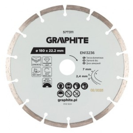 Disc de taiere diamantat segmentat, 180 x 22,2 mm, uscat si umed 57T311 de la GRAPHITE este un disc de taiere segmentat uscat si umed cu un diametru de 180 mm si o gaura de montare de 22,2 mm. Este inclus un inel de reducere practic. Segmentul de taiere este inalt de 7 mm si lat de 2,4 mm. Viteza maxima a discului este de 8 600 rpm, corespunzind la 80 m/s. Discul GRAPHITE indeplineste cerintele EN 13236 si este proiectat pentru taierea granitului, betonului, caramizii, pietrei si marmurei.
