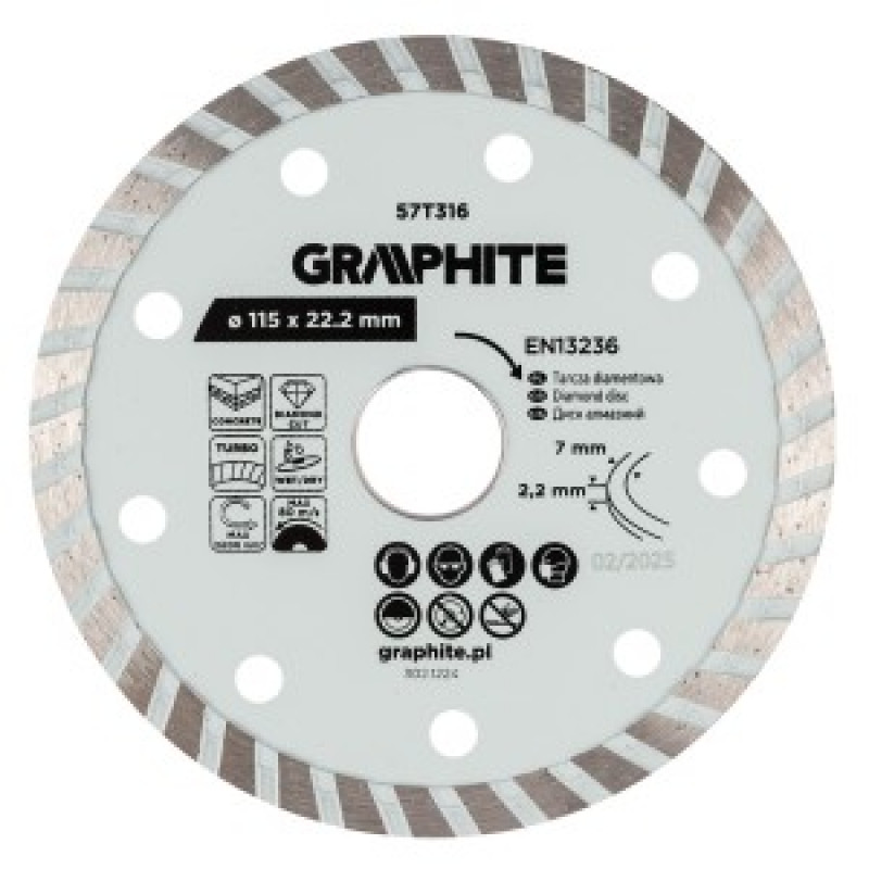 Disc turbo diamantat, 115 x 22,2 mm, uscat si umed 57T316 de la GRAPHITE este un disc turbo diamantat uscat si umed cu un diametru de 115 mm si o gaura de montare de 22,2 mm. Este inclus un inel de reducere practic. Segmentul de taiere este de 7 mm inaltime si 2,2 mm latime. Viteza maxima a discului este de 13 200 rpm, corespunzind la 80 m/s. Discul GRAPHITE indeplineste cerintele EN 13236 si este proiectat pentru taierea pietrei, caramizii, marmurei, granitului si betonului.