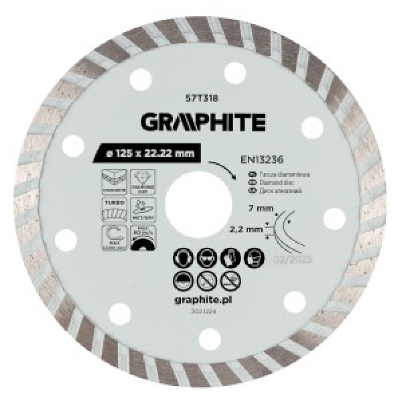 Disc turbo diamantat, 125 x 22,2 mm, uscat si umed 57T318 de la GRAPHITE este un disc turbo diamantat uscat si umed cu un diametru de 125 mm si o gaura de montare de 22,2 mm. Este inclus un inel de reducere practic. Segmentul de taiere este de 7 mm inaltime si 2,2 mm latime. Viteza maxima a discului este de 12 200 rpm, corespunzind la 80 m/s. Discul GRAPHITE indeplineste cerintele EN 13236 si este proiectat pentru taierea pietrei, caramizii, marmurei, granitului si betonului.